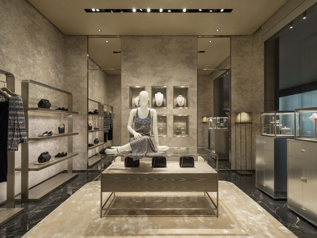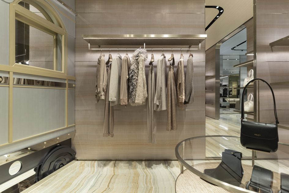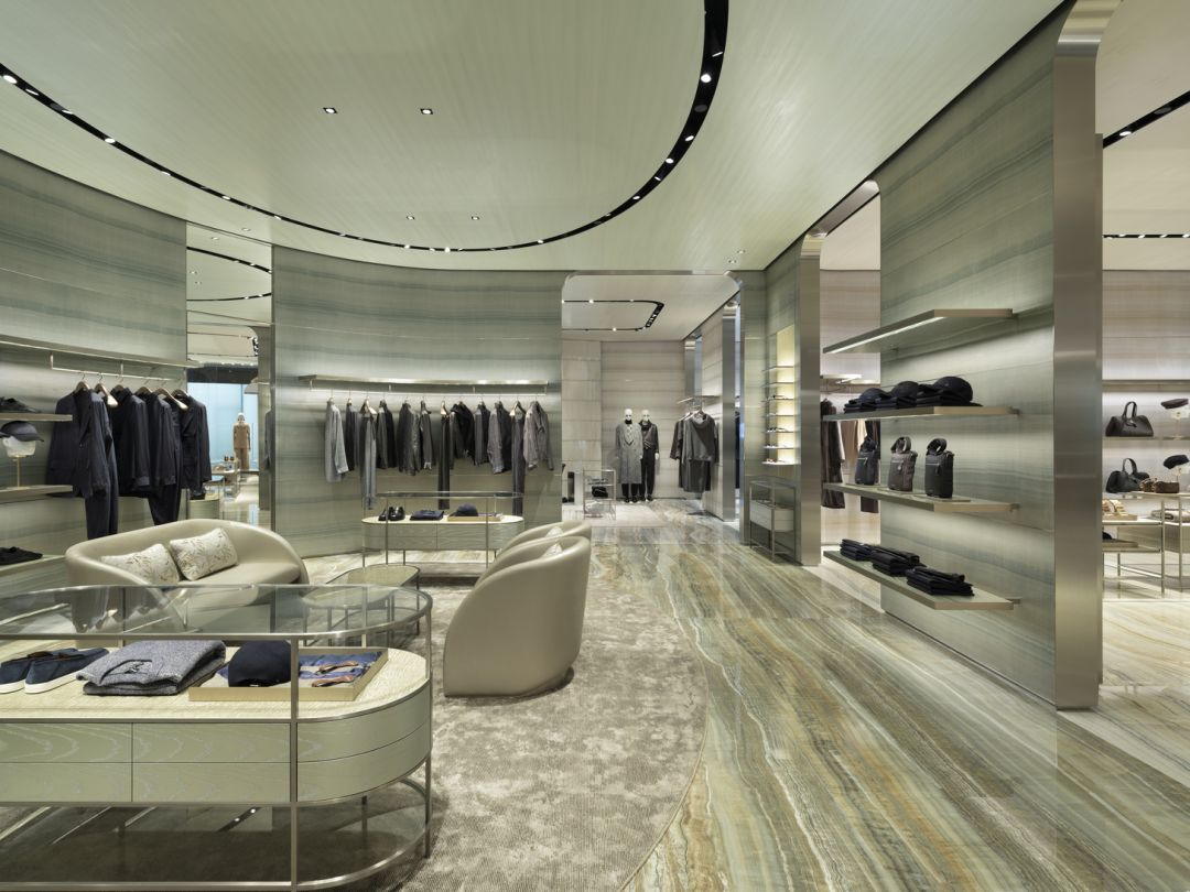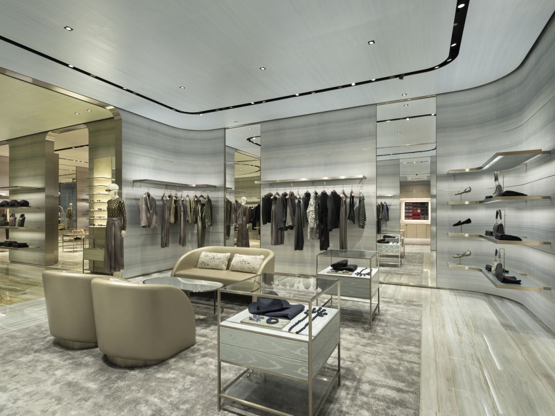 ความประณีตของ Giorgio Armani Boutique แห่งใหม่ ยังขับเน้นออกมา ผ่านวัสดุระดับพรีเมียม ตั้งแต่โลหะแพลทินัม ลายไม้เมทัลลิก ไปจนถึงผนังผ้าไหมจาก Armani/Casa เฉิดฉายเป็นพิเศษในห้องMade-to-Measure และห้อง VIC โทนสีและลวดลายพื้นหินอ่อนและออนิกซ์ล้อไปกับเพดานมาร์โมริโนทำมือ สร้างความกลมกลืนลงตัวทั้งร้าน เฟอร์นิเจอร์ทุกชิ้น ทั้งที่นั่ง พรม ผ้าและโคมไฟ ล้วนคัดสรรจากคอลเลกชันเดียวกัน
