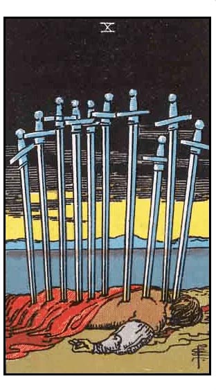 อิทธิพลของไพ่ 10 ดาบ (Ten of Swords) คุณจะเสียเงินเพราะคนอื่นทำเรื่องให้ เล่นเอาหมุนเงินตัวเป็นเกลียว และที่หวังการเสี่ยจะได้ไม่คุ้มเสีย ด้านการงานให้ระวังเพื่อนร่วมงานจะแทงข้างหลัง และที่มีงานส่วนตัวจะมีปัญหาเรื่องบริวาร ดังนั้นควรควบคุมให้ดี ด้านความรักอย่าอย่าเอาใจตนเองมากเกิน มิฉะนั้นจะมีปัญหากับคนรักบ่อยๆ และคนที่แอบชอบใครอยู่วืดสนิท ควรทำบุญทำทานตามโอกาสอันควรเพื่อเสริมดวงชะตาตนเอง