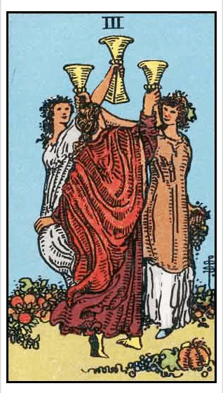 อิทธิพลของไพ่ 3 ถ้วย (Three of Cups) คุณที่กำลังลุ้นชอบอยู่ จะสมหวัง และคนที่คบหากันมานาน จะตกลงปลงใจใช้ชีวิตคู่ ด้านการเงินมีโชคเข้ามาจากคนรัก ควรนำเงินบางส่วนไปทำบุญกับเด็กกำพร้า จะทำให้เรามีโชคบ่อยๆ ด้านการงานคนที่ทำงานประจำไปได้ด้วยดี มีผลงานเกินหน้าเกินตาคนอื่น และที่มีมีธุรกิจส่วนตัวไปได้ดีมีงานเข้าตลอด ควรทำบุญไหว้บูชาเจ้าแม่กวนอิมเพื่อเสริมดวงชะตาตนเอง