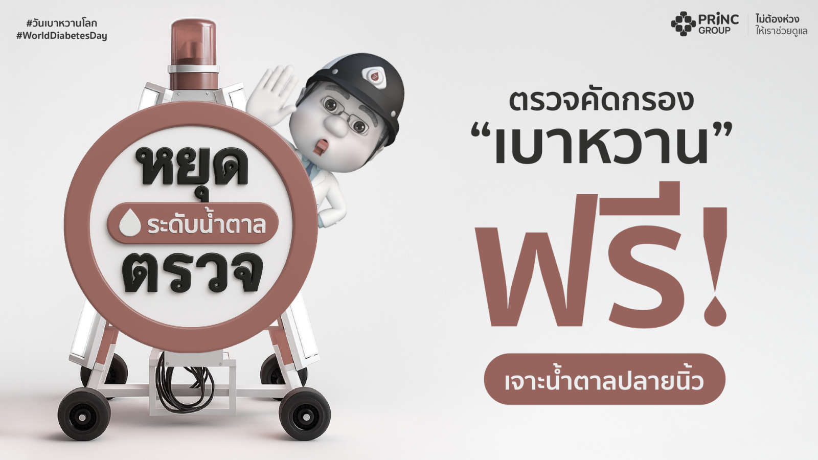 วันที่ 14 พฤศจิกายน 2568 (วันเบาหวานโลก) โรงพยาบาลพริ้นซ์ สุวรรณภูมิ เวลา 09.00–12.00 น. และโรงพยาบาลวิรัชศิลป์ ชุมพร เวลา 10.00–16.00 น. ณ โลตัสชุมพร รูปแบบ Drive Thru โรงพยาบาลพริ้นซ์ สกลนคร เวลา 09.00-12.00 น. ณ OPD ชั้น 1 โรงพยาบาลพริ้นซ์ อุบลราชธานี เวลา 10.00-12.00 น. วันที่ 15 พฤศจิกายน 2568 — โรงพยาบาลพริ้นซ์ ปากน้ำโพ เวลา 09.00–12.00 น.