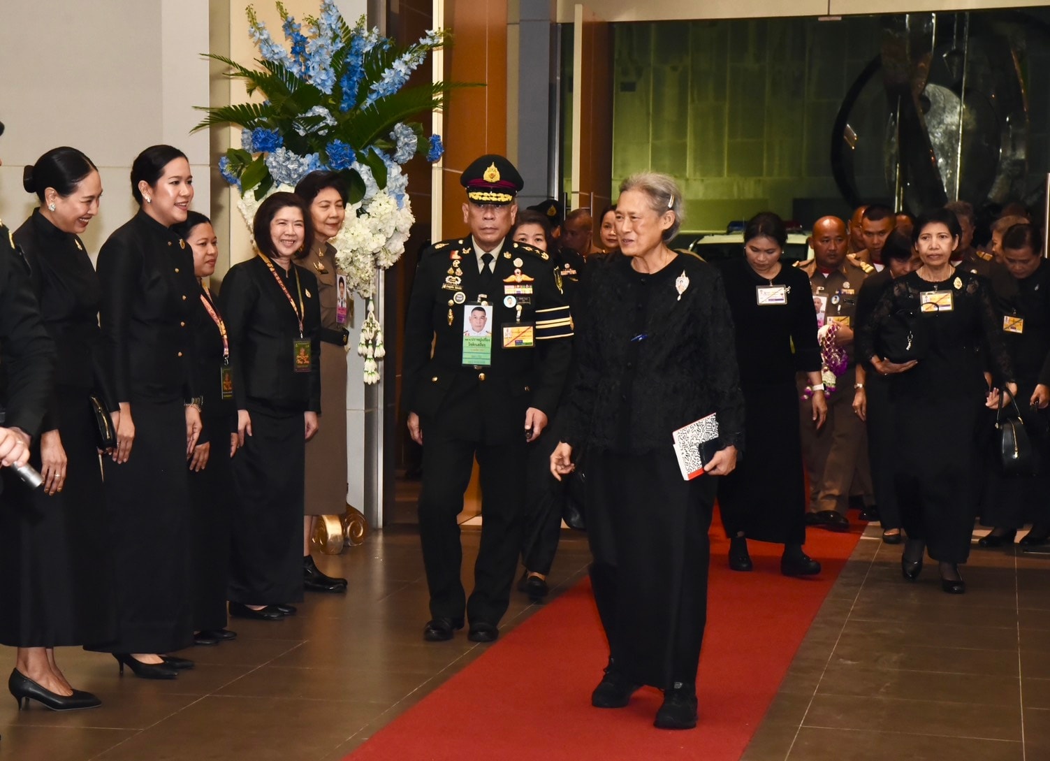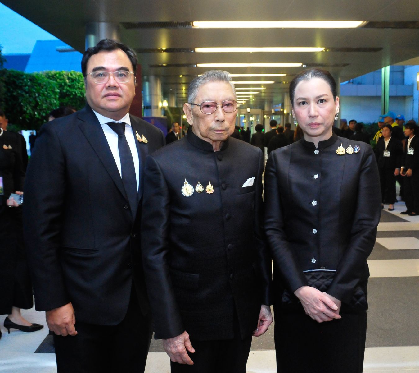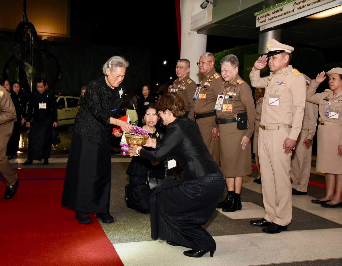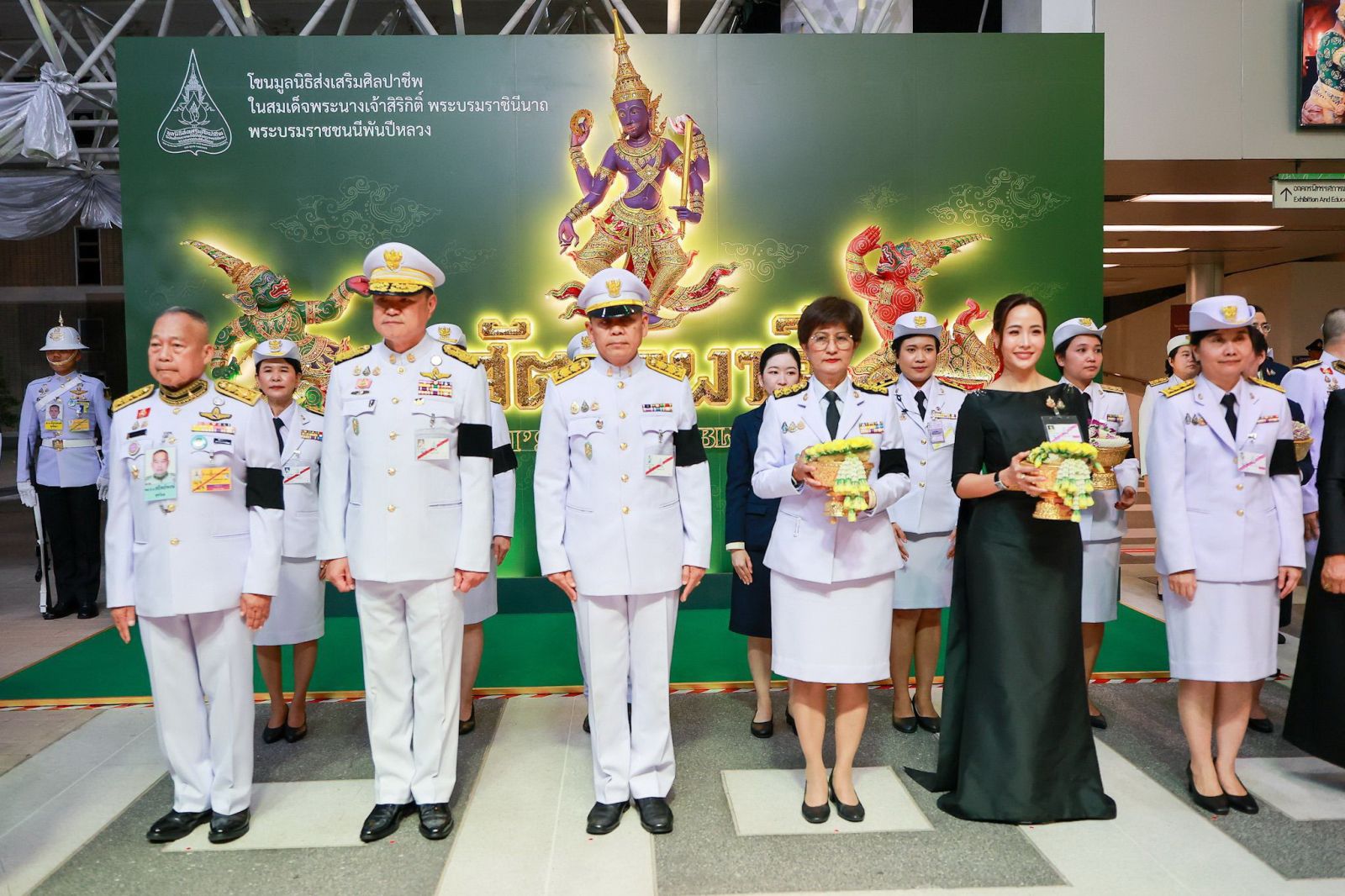 พล.อ.อ.สถิตย์พงษ์ สุขวิมล รอง ปธ.กก.และเลขาธิการ มูลนิธิส่งเสริมศิลปาชีพฯ ปธ.กก.อำนวยการ โขนมูลนิธิส่งเสริมศิลปาชีพฯ, อนุทิน ชาญวีรกูล นายกรัฐมนตรี, ประสพ เรียงเงิน ปลัด วธ., นฤมล ล้อมทอง กก.มูลนิธิส่งเสริมศิลปาชีพฯ , ธนนนท์ นิรามิษ ภริยานายกรัฐมนตรี และ ยุถิกา อิศรางกูร ณ อยุธยา อธิบดีกรมส่งเสริมวัฒนธรรม เฝ้ารับเสด็จฯ