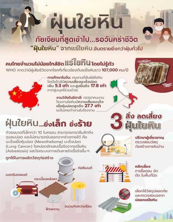 • WHO คาดว่า มีผู้เสียชีวิตจากโรคที่เกี่ยวข้องกับแร่ใยหินราว 107,000 คน/ปี