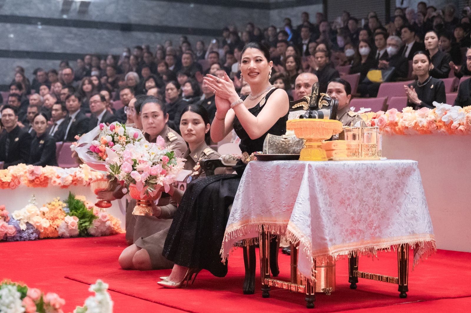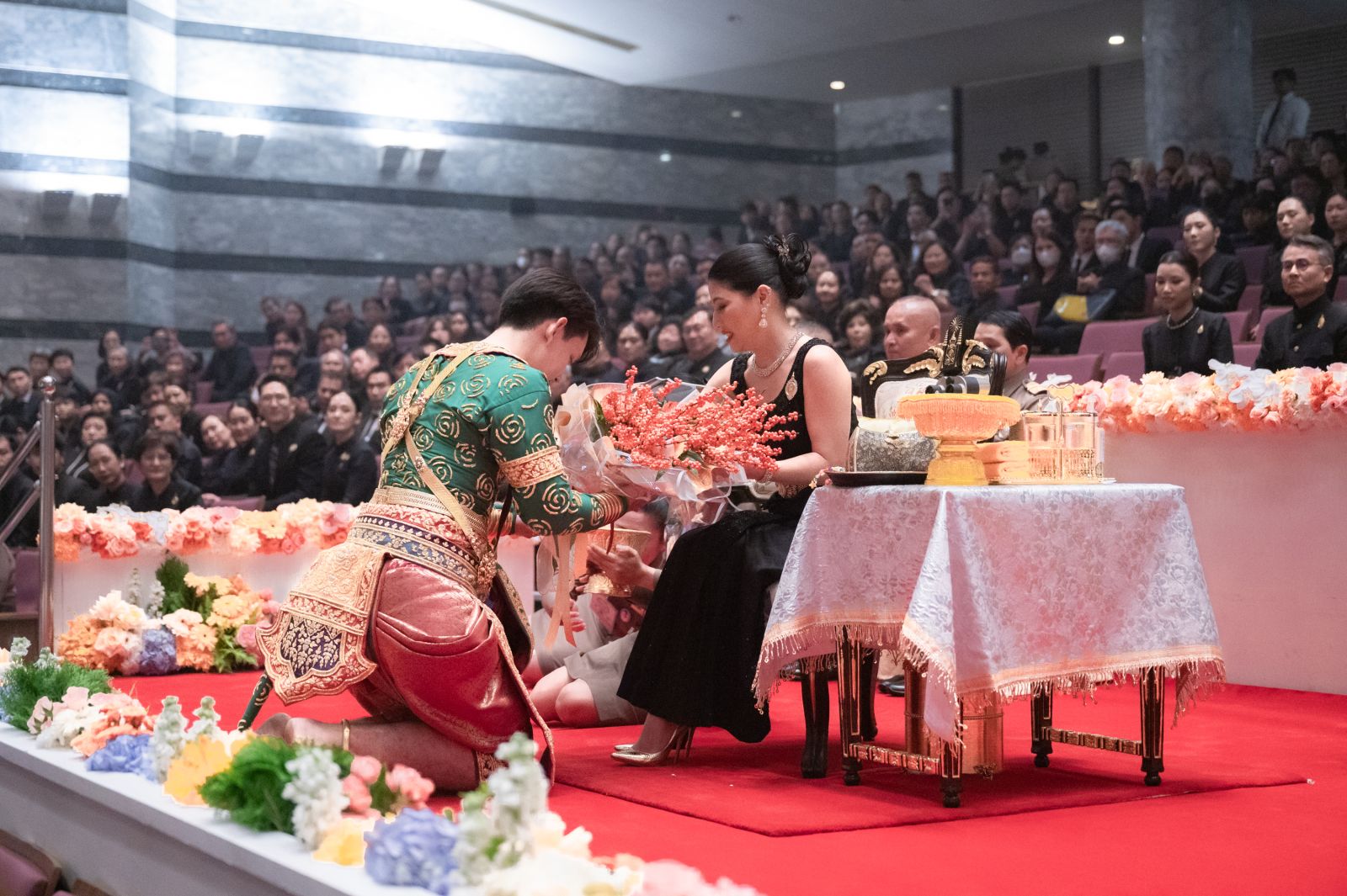 การนี้ เสด็จเข้าสู่หอประชุมใหญ่ ศูนย์วัฒนธรรมแห่งประเทศไทย พระราชทานพระวโรกาสให้ นางสาวนิตติกาล สุขกลิ่น (ผู้แสดงมณโฑ) ผู้แทนนักแสดงทูลเกล้าฯ ถวายสูจิบัตร แล้วทอดพระเนตรการแสดงรำอาศิรวาทรำลึกพระมหากรุณาธิคุณ ทอดพระเนตรวีดิทัศน์เบื้องหลังการจัดการแสดงโขนรอบปฐมทัศน์ เรื่อง รามเกียรติ์ ตอน สัตยาพาลี และทอดพระเนตรการแสดงตามลำดับ และเมื่อจบการแสดง พระราชทานพระวโรกาสให้ นาวาอากาศเอก สุพัฒน์ แก้วภา ประจำสำนักพระราชวังพิเศษ ระดับ 10 เบิกผู้แทนคณะทำงาน และนักแสดง โขนมูลนิธิส่งเสริมศิลปาชีพฯ ได้แก่ รองศาสตราจารย์ ศุภชัย จันทร์สุวรรณ์ ศิลปินแห่งชาติ/ผู้กำกับการแสดง นายสมศักดิ์ ทัดติ ผู้แทนผู้เชี่ยวชาญและครูผู้ฝึกซ้อมการแสดง (โขนยักษ์) นายลำยอง โสวัตร ผู้แทนครูผู้ฝึกซ้อมการบรรเลงและขับร้อง นายวิชัย รักชาติ ผู้แทนฝ่ายศิลป์ ฉากและอุปกรณ์การแสดง และนายธันย์ชนก อุ่นบางหลวง (ผู้แสดงพาลี) ผู้แทนนักแสดง เข้าเฝ้ารับพระราชทานช่อดอกไม้