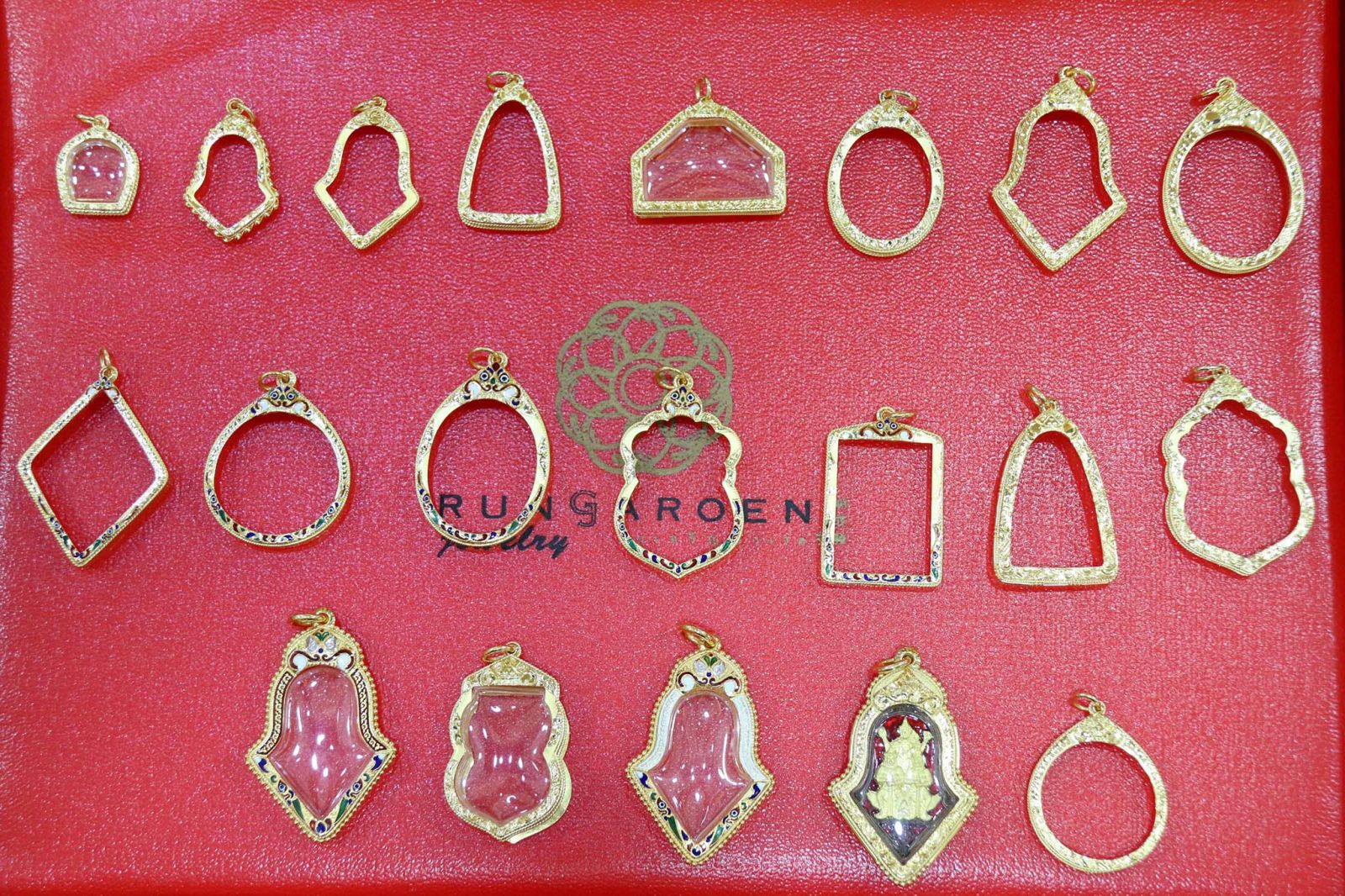 ผลิตภัณฑ์ของรุ่งเจริญครอบคลุมตั้งแต่กรอบพระทองคำหลากหลายรูปแบบ พระเลี่ยมทองสำเร็จรูปผ่านพิธีปลุกเสก วัตถุมงคลดีไซน์เฉพาะ เช่น ชุดพระ 12 นักษัตร บริการสั่งทำพิเศษ (OEM) ขั้นต่ำ 50 ชิ้น รวมถึงเครื่องประดับแฟชั่น เช่น ต่างหูและสร้อยคอที่ออกแบบทันสมัย โดยสามารถปรับน้ำหนักทองเพื่อควบคุมราคาให้เหมาะสมได้ตามต้องการ