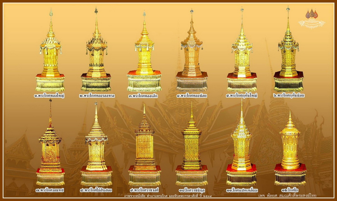 3.โกศทอง ใช้ทองคำเป็นวัสดุหลัก ตกแต่งอย่างวิจิตร ใช้สำหรับพระบรมวงศ์หรือผู้มีฐานะสูงสุด