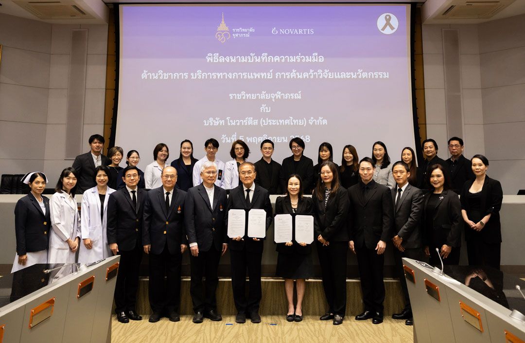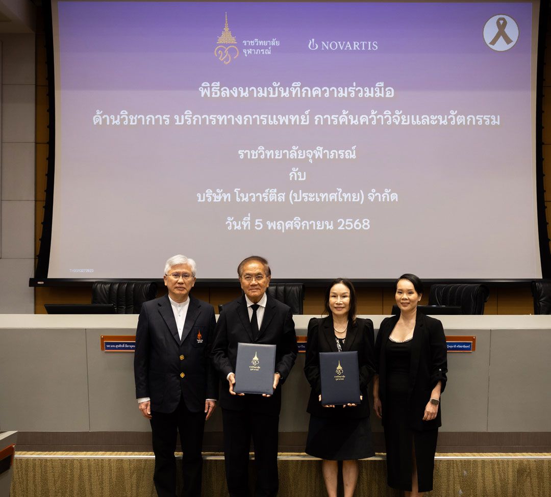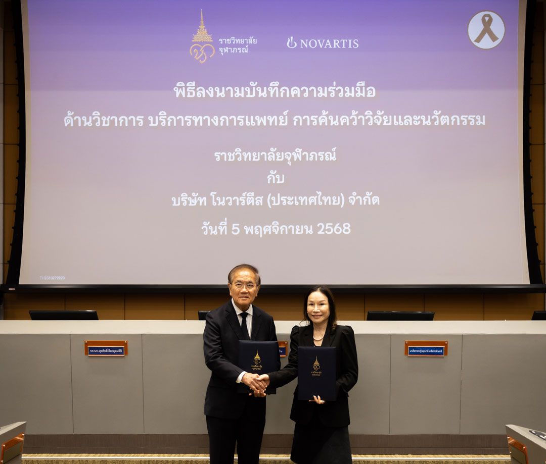 ราชวิทยาลัยจุฬาภรณ์ และ บริษัท โนวาร์ตีส (ประเทศไทย) จำกัด ร่วมลงนามในบันทึกข้อตกลงความร่วมมือ (MOU) ทางด้านวิชาการ บริ การทางการแพทย์ การค้นคว้าวิจัย และนวัตกรรม โดยมี ศาสตราจารย์เกียรติคุณ นายแพทย์รัชตะ รัชตะนาวิน รักษาการรองเลขาธิการราชวิทยาลัยจุฬาภรณ์ พร้อมด้วย รองศาสตราจารย์ นายแพทย์สุรศักดิ์ ลีลาอุดมลิปิ รักษาการผู้อำนวยการโรงพยาบาลจุฬาภรณ์ และ เภสัชกรหญิงสุมาลี คริสธานินทร์ ประธานบริหาร บริษัท โนวาร์ตีส (ประเทศไทย) จำกัด พร้อมด้วย วรรณวิมล สินทราพรรณทร ผู้แทนของบริษัท โนวาร์ตีส (ประเทศไทย) จำกัด ร่วมลงนามในบันทึกข้อตกลงความร่วมมือดังกล่าว พร้อมกันนี้ ซัง ลี ผู้อำนวยการฝ่ายสื่อสารองค์กรและการสนับ สนุนผู้ป่วย โนวาร์ติส ภาคพื้นเอเชียแปซิฟิคตะวันออกกลางและแอฟริกา ร่วมกล่าวสุนทรพจน์ ภายในงาน ณ ห้องประชุมใหญ่ ชั้น 3 อาคารสำนัก งานราชวิทยาลัยจุฬาภรณ์ เขตหลักสี่ กรุงเทพมหานคร