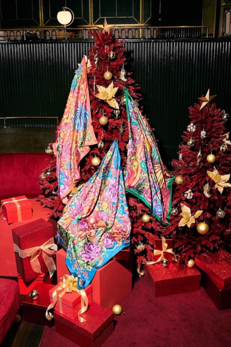 ผ้าพันคอสี่เหลี่ยมจัตุรัสขนาด 33" x 33" ทำจากผ้าไหมทวิล 100% ในโทนสีส้ม เขียว และน้ำเงิน พิมพ์ลายด้วยกระบวนการอันพิถีพิถันของจิม ทอมป์สัน เพื่อคงลายเส้นและเท็กซ์เจอร์พู่กันของศิลปินไว้ได้อย่างสมบูรณ์ ลาย Jolly ถ่ายทอดความรักและพลังบวกในช่วงเทศกาล ลาย Fond สะท้อนความอบอุ่นบนโต๊ะอาหารที่ทุกคนได้มาแบ่งปันโมเมนต์ดี ๆ ส่วนลาย Adorn อวดของตกแต่งช่วงเทศกาลที่เปล่งประกายแวววาว