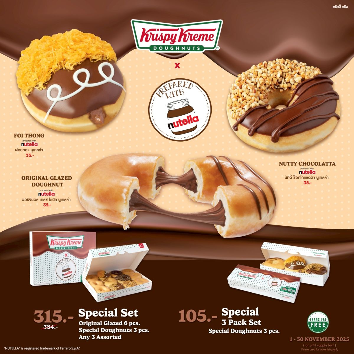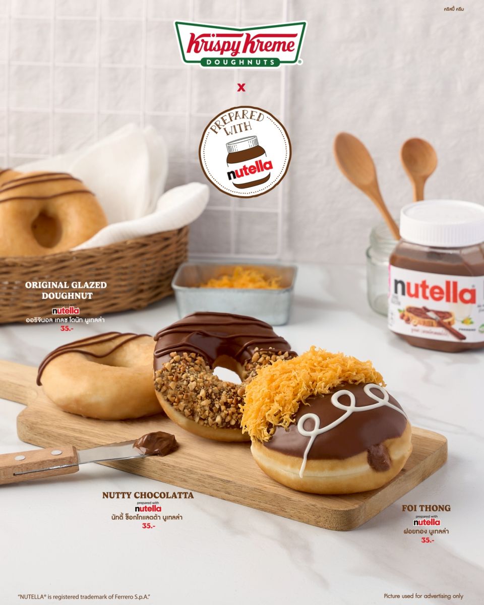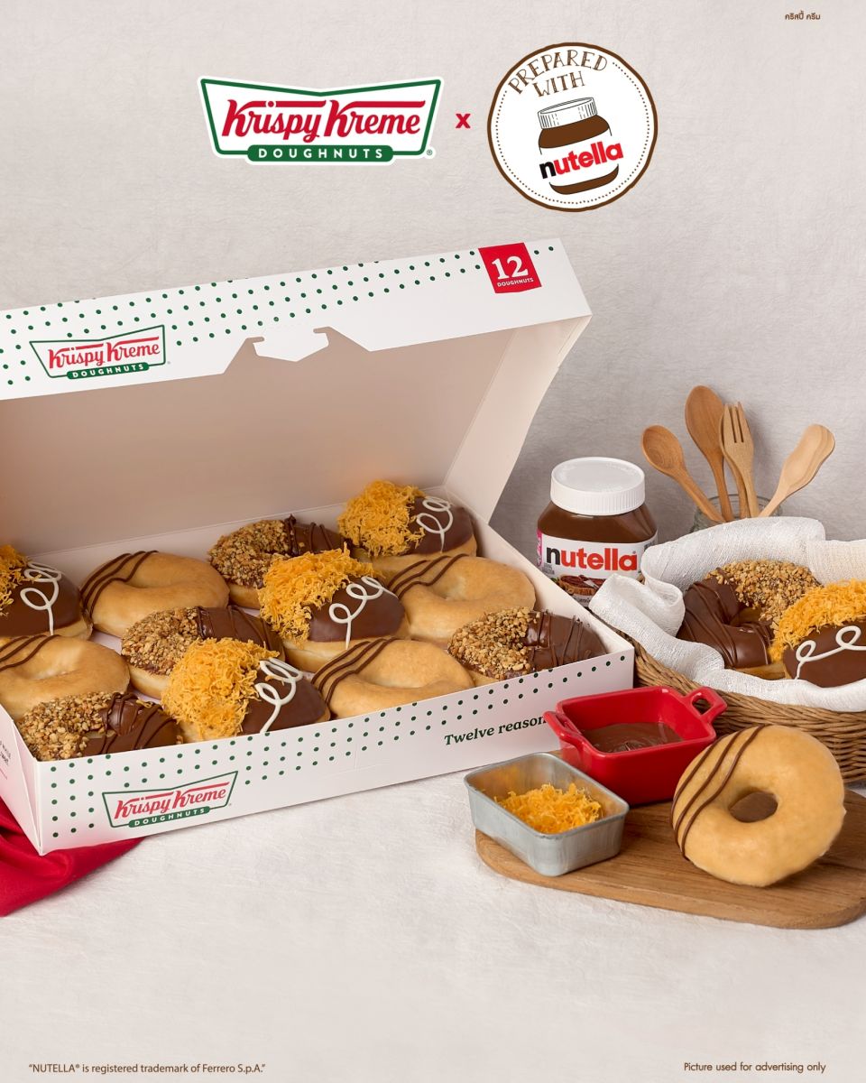 คริสปี้ ครีม (Krispy Kreme) โดนัทสูตรลิขสิทธิ์อันดับ 1 ที่ครองใจคนทั่วโลก ต้อนรับเดือนพฤศจิกายนด้วย “Krispy Kreme x prepared with Nutella” โดนัทรสโปรดที่แฟนคลับต่างคิดถึง ความอร่อยลงตัวของโดนัทเนื้อนุ่ม ผสานความเข้มข้นของนูเทลล่า เริ่มที่ ออริจินอล เกลซ โดนัท นูเทลล่า (Original Glazed Doughnut prepared with Nutella) โดนัทออริจินอล เกลซ สอดไส้นูเทลล่าเน้น ๆ ตกแต่งด้วยนูเทลล่าอีกชั้น ให้ความอร่อยแบบดับเบิ้ล ต่อด้วย นัทตี้ช็อกโกแลตต้า นูเทลล่า (Nutty Chocolatta prepared with Nutella) โดนัทเนื้อนุ่มเคลือบนูเทลล่าจัดเต็ม โรยพีนัท ครัช เพิ่มความกรุบกรอบ เคี้ยวเพลินในทุกคำ พร้อมรสชาติใหม่ล่าสุด ฝอยทอง นูเทลล่า (Foi Thong prepared with Nutella) โดนัทสอดไส้นูเทลล่าครีม เคลือบด้วยนูเทลล่าเข้มข้น ตกแต่งด้วยไวท์ช็อกโกแลตและฝอยทองหอมหวาน เพิ่มความกลมกล่อมในรสสัมผัสที่ไม่เหมือนใคร