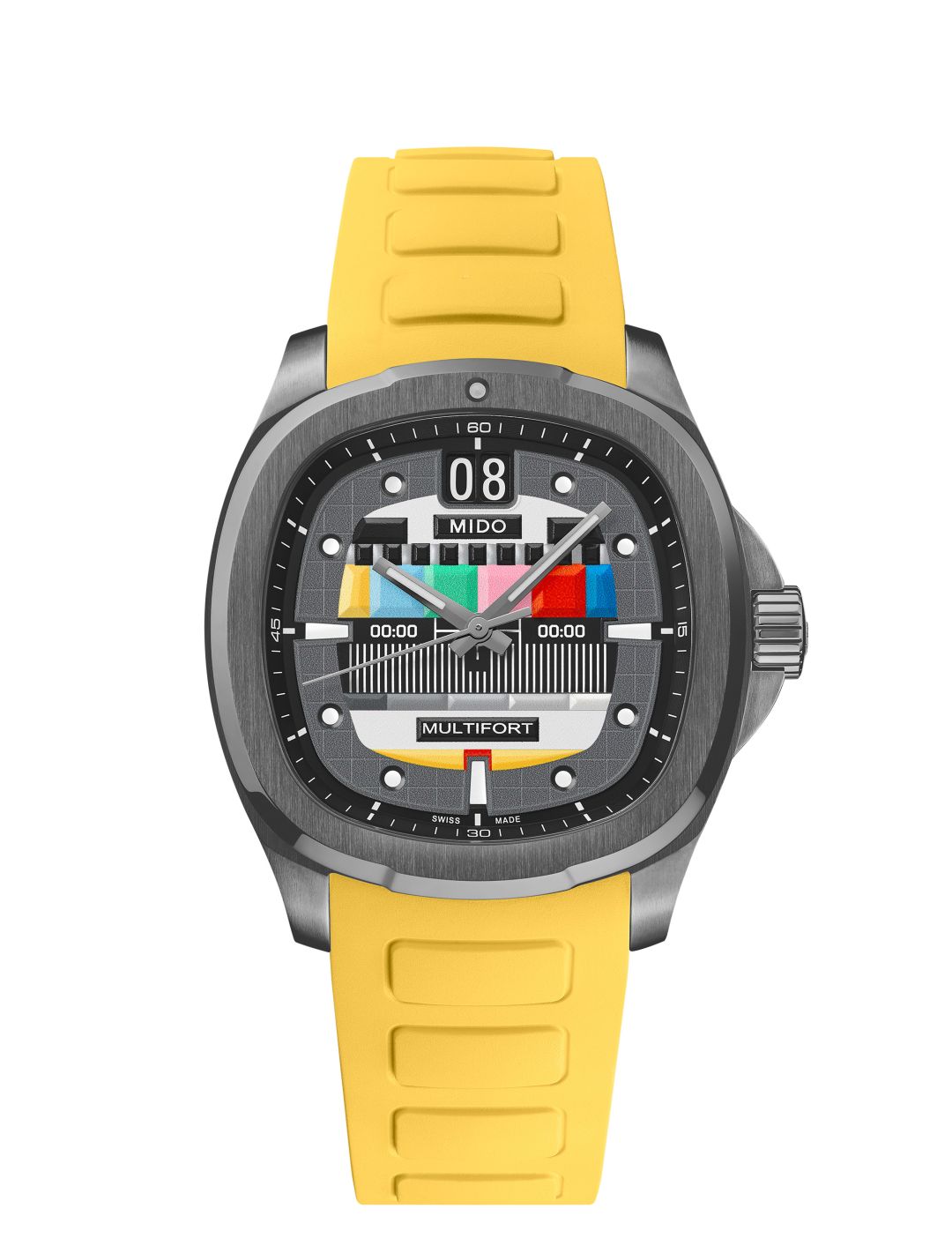 ในครั้งนี้ มิโด (MIDO) กลับมาจุดประกายและเติมสีสันให้วงการเรือนเวลาอีกครั้งกับผลงานล่าสุดในคอลเลกชั่นพิเศษ มัลติฟอร์ท ทีวี บิ๊ก เดท สเปเชียล อิดิชั่น เอส01อี02 (Multifort TV Big Date Special Edition S01E02) โดยหยิบยกแรงบันดาลใจจากยุคทองของจอโทรทัศน์มาถ่ายทอดผ่านหน้าปัดดีไซน์อันเป็นเอกลักษณ์ ที่จำลองลวดลายแถบคลื่นสัญญาณรบกวนหลากสีสุดคลาสสิกชวนให้รำลึกถึงวันวาน ให้กลายเป็นองค์ประกอบอันโดดเด่นบนหน้าปัดทรงทีวีสุดคลาสสิกที่สะท้อนกลิ่นอายเรโทร โดยคอลเลกชั่นนี้มาพร้อมตัวเรือนสเตนเลสสตีลเคลือบพีวีดีสีเทาขัดซาติน ชวนให้นึกถึงโลหะดิบ ซึ่งเป็นครั้งแรกที่วัสดุนี้ถูกนำมาใช้ในตระกูลของมัลติฟอร์ททีวีและเติมเต็มลุคโมโนโครมให้โดดเด่นยิ่งขึ้น ตัวสายถูกขัดเงาบริเวณข้อตรงกลาง และออกแบบให้เชื่อมต่อกับตัวเรือนได้อย่างเรียบเนียน นอกจากนี้ยังมาพร้อมสายนาฬิกา 3 สไตล์ ทั้งสายสแตนเลสสตีลที่ให้ลุคเรียบหรูดูสุขุม และสายนาฬิกายาง 2 เฉดสีที่มีดีไซน์ปั๊มลวดลายนูน ทั้งสีน้ำเงินสดเติมความเท่แบบโมเดิร์น และสีเหลืองสดที่ช่วยเพิ่มความสนุกสนานให้กับลุค มาพร้อมกรอบตัวเรือนขนาด 40 มิลลิเมตร บนหน้าปัดดีไซน์เฉพาะในธีมทีวีสุดวินเทจ ถ่ายทอดลวดลายคลื่นสัญญาณรบกวนหลากสีที่โดดเด่นตัดกับพื้นหลังสีเทา เสริมมิติให้โดดเด่นยิ่งขึ้นด้วยการขึ้นรูปนูนที่สะกดทุกสายตา โดยมีช่องแสดงวันที่ขนาดใหญ่ (Big Date) ที่ตำแหน่ง 12 นาฬิกา ใช้ตัวเลขสีขาวบนพื้นดำเพื่อให้อ่านค่าได้อย่างชัดเจน ด้านในหน้าปัดเสริมขอบแสดงนาที (Flange) เพื่อช่วยเพิ่มความชัดเจนในการอ่านเวลา