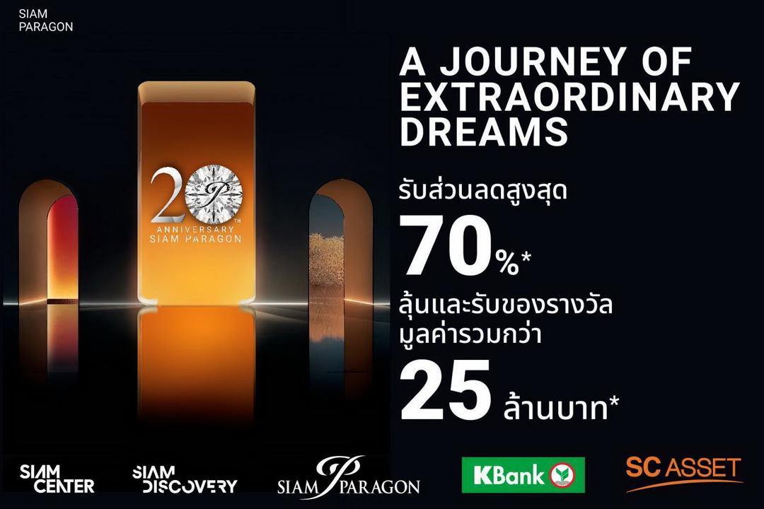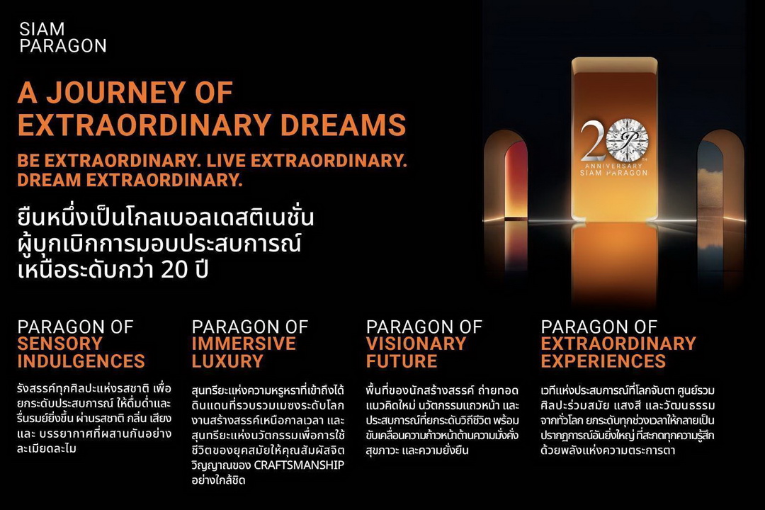 และในปีนี้ สยามพารากอนฉลองครบรอบ 20 ปีสุดยิ่งใหญ่ภายใต้แนวคิด “A Journey of Extraordinary Dreams” ผนึกกำลังทั้ง ศูนย์ฯ และห้างฯ มอบประสบการณ์เหนือระดับกับกิจกรรมสุดพิเศษ ระหว่างวันที่ 29-30 พ.ย. 2568 เนรมิตทุกตารางเมตร ตั้งแต่ชั้น B ถึงชั้น 5 ทุกชั้นทุกแผนกให้เป็นอาณาจักรแห่งความสุข หรรษา และสร้างแรงบันดาลใจให้แก่กลุ่มลูกค้าครอบคลุมทุกเป้าหมาย อาทิ