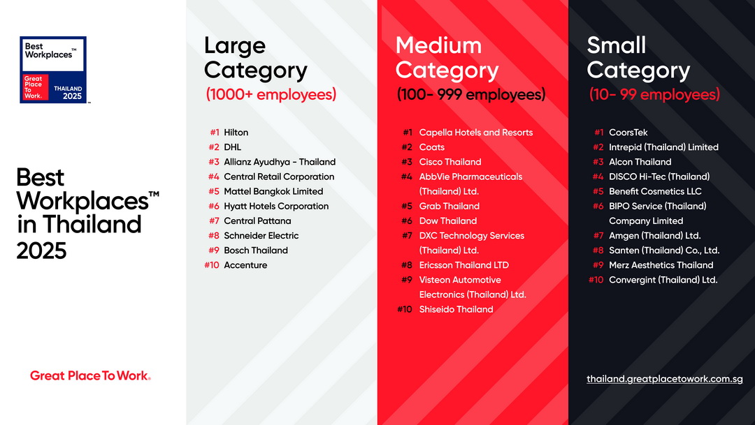 Great Place To Work® องค์กรชั้นนำระดับโลกด้านวัฒนธรรมองค์กร เผยรายชื่อ Best Workplaces™ in Thailand 2025 อย่างเป็นทางการภายในงานแถลงข่าวและพิธีมอบรางวัลสุดยิ่งใหญ่ ณ โรงแรม Millennium Hilton Bangkok เพื่อเฉลิมฉลองให้องค์กรที่เป็นแบบอย่างแห่งความไว้วางใจ ความเท่าเทียม และภาวะผู้นำที่ให้ความสำคัญกับ “คน” ในการขับเคลื่อนการเปลี่ยนแปลงในทุกอุตสาหกรรม