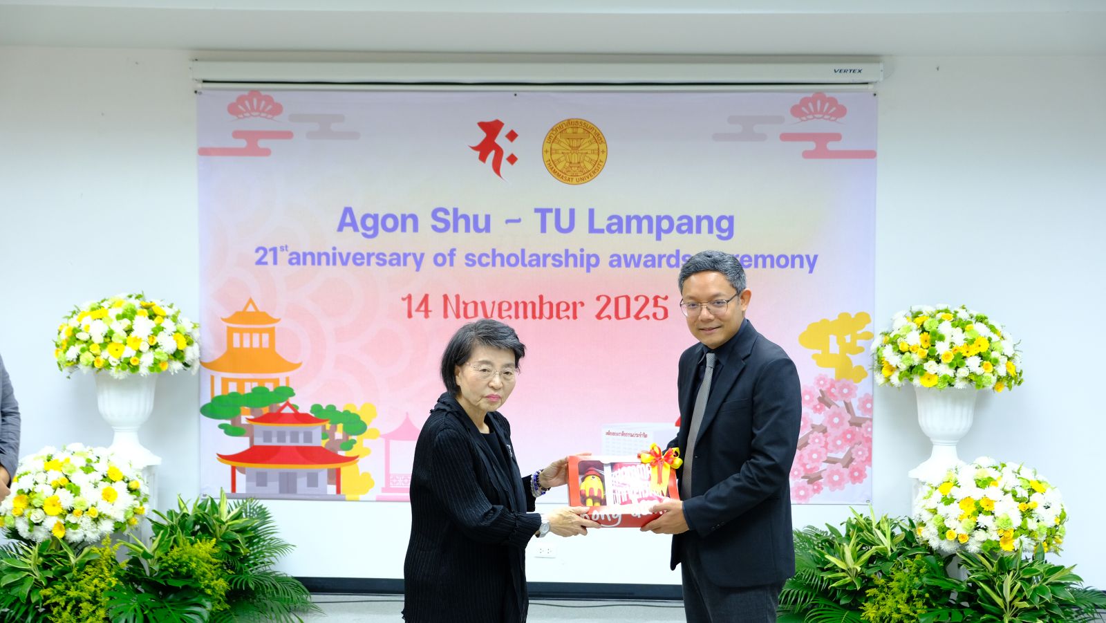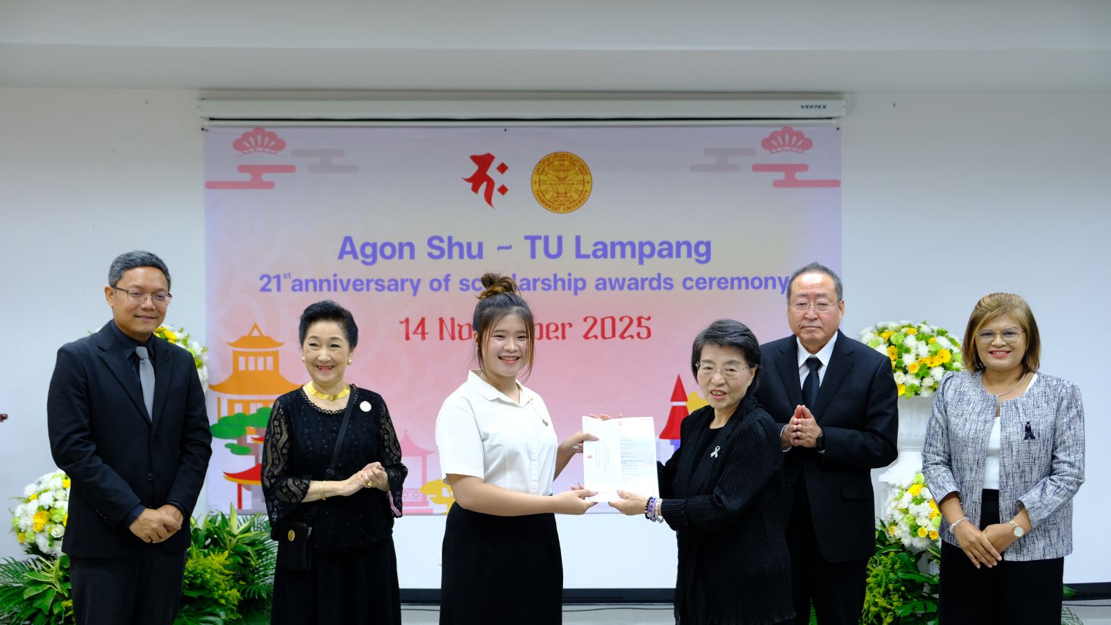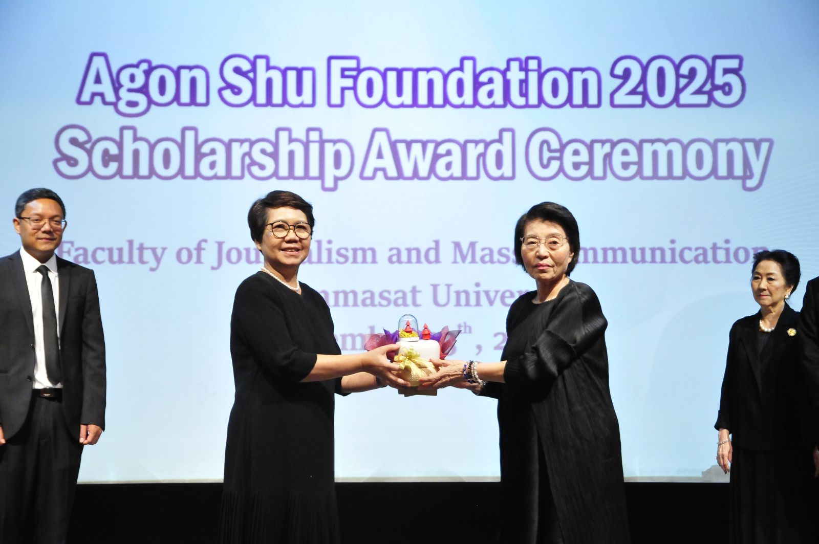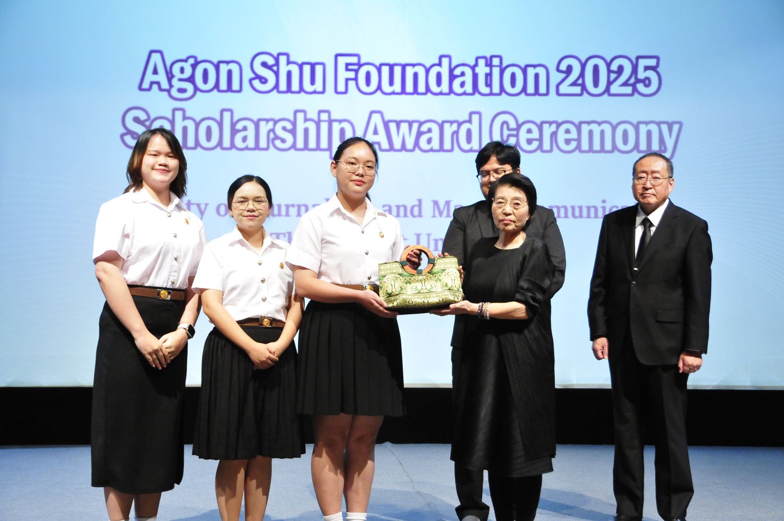 มูลนิธิอากอนชู นำโดย Ms. Kazuko Maki พร้อมด้วย Mr. Shimabukuro Masaru ผู้แทนมูลนิธิอากอนชู จัดพิธีมอบทุนการศึกษา ประจำปี 2568 ให้กับนักศึกษาคณะวารสารศาสตร์และสื่อสารมวลชน มหาวิทยาลัยธรรมศาสตร์ รังสิต โดยได้รับเกียรติจาก ศ.ดร.สมคิด เลิศไพฑูรย์ อดีตอธิบการบดี มธ, ผาณิต พูนศิริวงศ์ อดีตนายกสมาคมวารสารศาสตร์ฯ ธรรมศาสตร์ ผู้ประสานงานมูลนิธิฯ ผศ.ดร.ปกป้อง ส่องเมือง ผู้ประสานงานมูลนิธิอากอนชู รศ.ดร.กิตติวัฒน์ จันทร์แจ่มใส รองอธิการบดีฝ่ายบริหารศูนย์ลำปางและการนักศึกษา ผศ.ดร.อัจฉรา ปัณฑรานุวงศ์ คณบดีคณะวารสารศาสตร์ฯ คณะผู้บริหารคณาจารย์ ร่วมงาน ในปีนี้มีนักศึกษาได้รับทุนทั้งสิ้น 20 ทุน รวมเป็นเงินกว่า 500,000 บาท ณ โรงภาพยนตร์คณะวารสารศาสตร์ มหาวิทยาลัยธรรมศาสตร์ รังสิต เมื่อวันที่ 13 พฤศจิกายน 2568