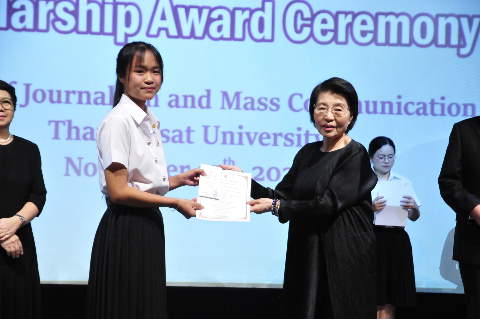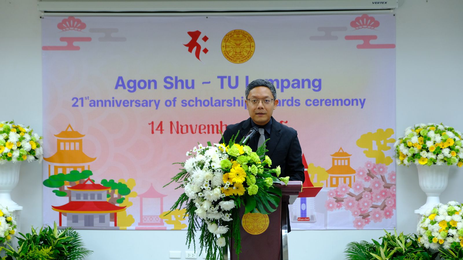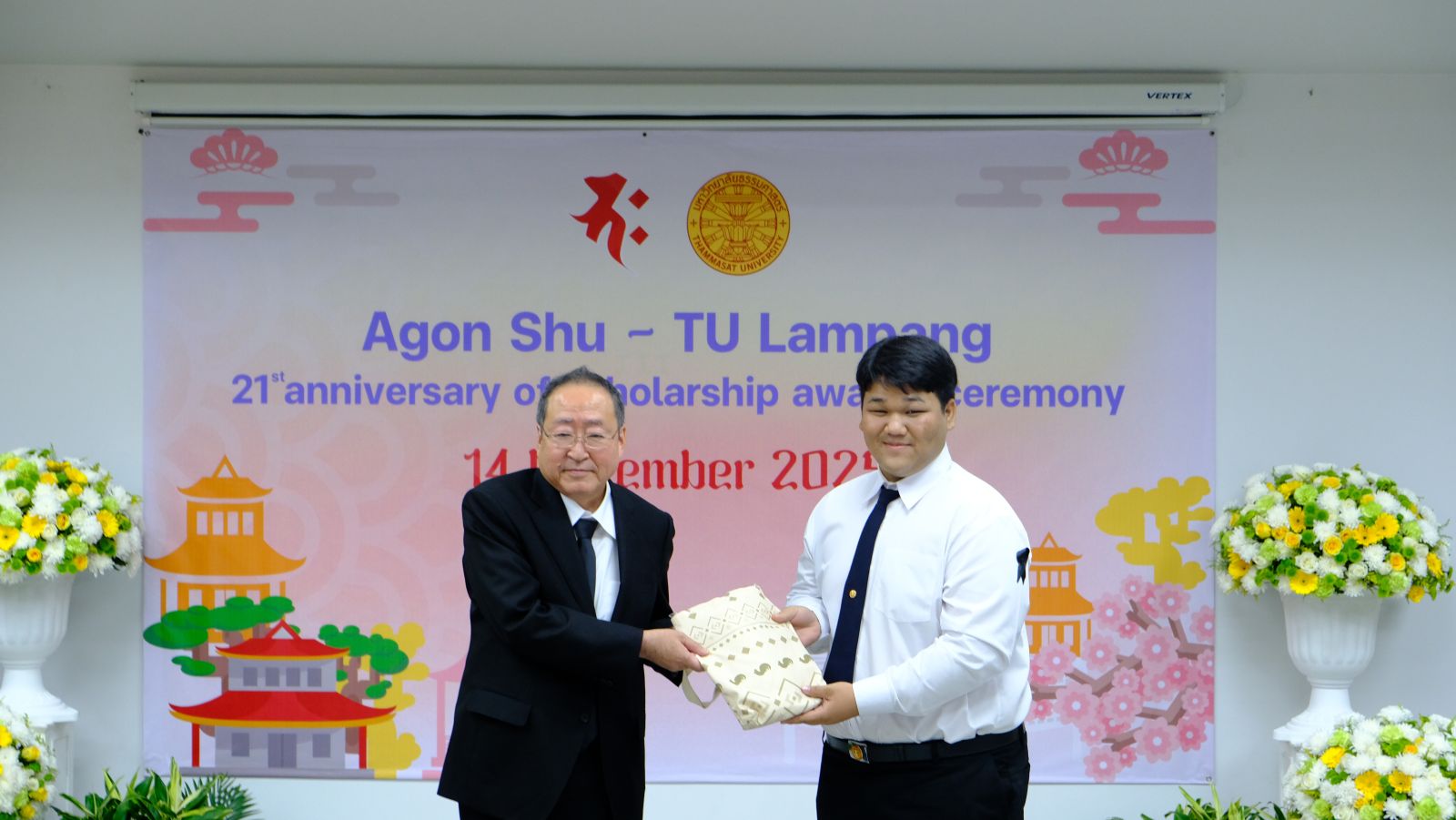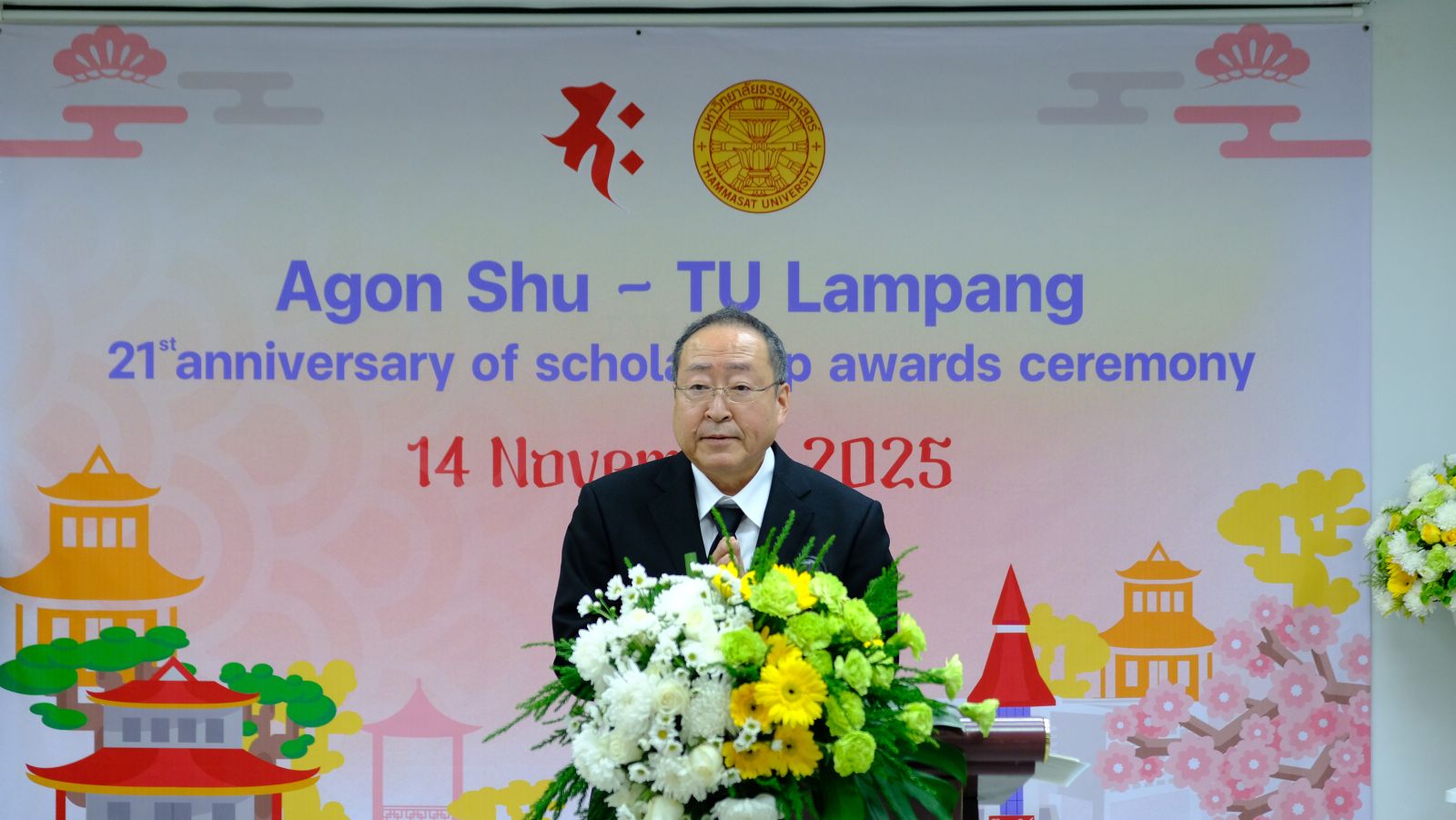 มูลนิธิอากอนชู นำโดย Ms. Kazuko Maki พร้อมด้วย Mr. Shimabukuro Masaru ผู้แทนมูลนิธิอากอนชู จัดพิธีมอบทุนการศึกษา ประจำปี 2568 ให้กับนักศึกษาคณะวารสารศาสตร์และสื่อสารมวลชน มหาวิทยาลัยธรรมศาสตร์ รังสิต โดยได้รับเกียรติจาก ศ.ดร.สมคิด เลิศไพฑูรย์ อดีตอธิบการบดี มธ, ผาณิต พูนศิริวงศ์ อดีตนายกสมาคมวารสารศาสตร์ฯ ธรรมศาสตร์ ผู้ประสานงานมูลนิธิฯ ผศ.ดร.ปกป้อง ส่องเมือง ผู้ประสานงานมูลนิธิอากอนชู รศ.ดร.กิตติวัฒน์ จันทร์แจ่มใส รองอธิการบดีฝ่ายบริหารศูนย์ลำปางและการนักศึกษา ผศ.ดร.อัจฉรา ปัณฑรานุวงศ์ คณบดีคณะวารสารศาสตร์ฯ คณะผู้บริหารคณาจารย์ ร่วมงาน ในปีนี้มีนักศึกษาได้รับทุนทั้งสิ้น 20 ทุน รวมเป็นเงินกว่า 500,000 บาท ณ โรงภาพยนตร์คณะวารสารศาสตร์ มหาวิทยาลัยธรรมศาสตร์ รังสิต เมื่อวันที่ 13 พฤศจิกายน 2568
