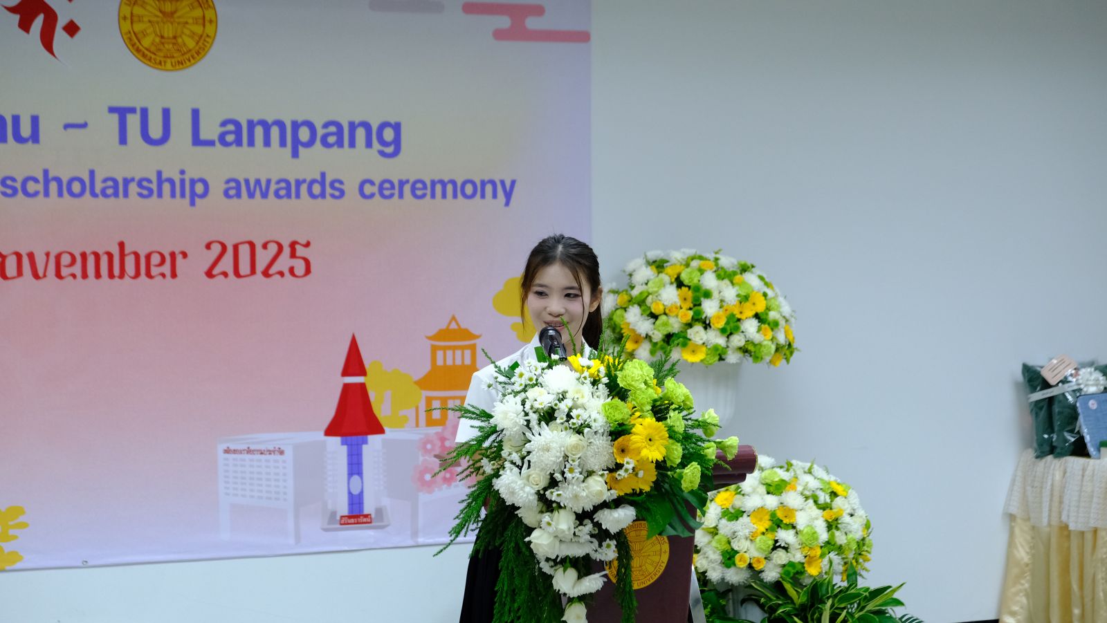 จากนั้นในวันที่ 14 พฤศจิกายน 2568 เป็นการมอบทุนให้กับนักศึกษา มหาวิทยาลัยธรรมศาสตร์ ศูนย์ลำปาง โดยมี รศ.ดร.กิตติวัฒน์ จันทร์แจ่มใส รองอธิการบดีฝ่ายบริหารศูนย์ลำปางและการนักศึกษา ให้การต้อนรับ ในปีการศึกษา 2568 มีนักศึกษาจาก มธ.ศูนย์ลำปาง ได้รับทุนจำนวน 30 ทุน ทุนละ 20,000 บาท จำนวนรวม 600,000 บาท โดยคัดเลือกจากนักศึกษาที่มีความประพฤติดี มีผลการเรียนที่ดี และเป็นผู้ขาดแคลนทุนทรัพย์
