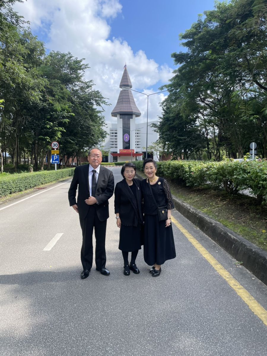 Mr.Shimabukuro Masaru, Ms. Kazuko Maki และ ผาณิต พูนศิริวงศ์ ถ่ายภาพที่หน้าโดม มธ.ศูนย์ลำปาง