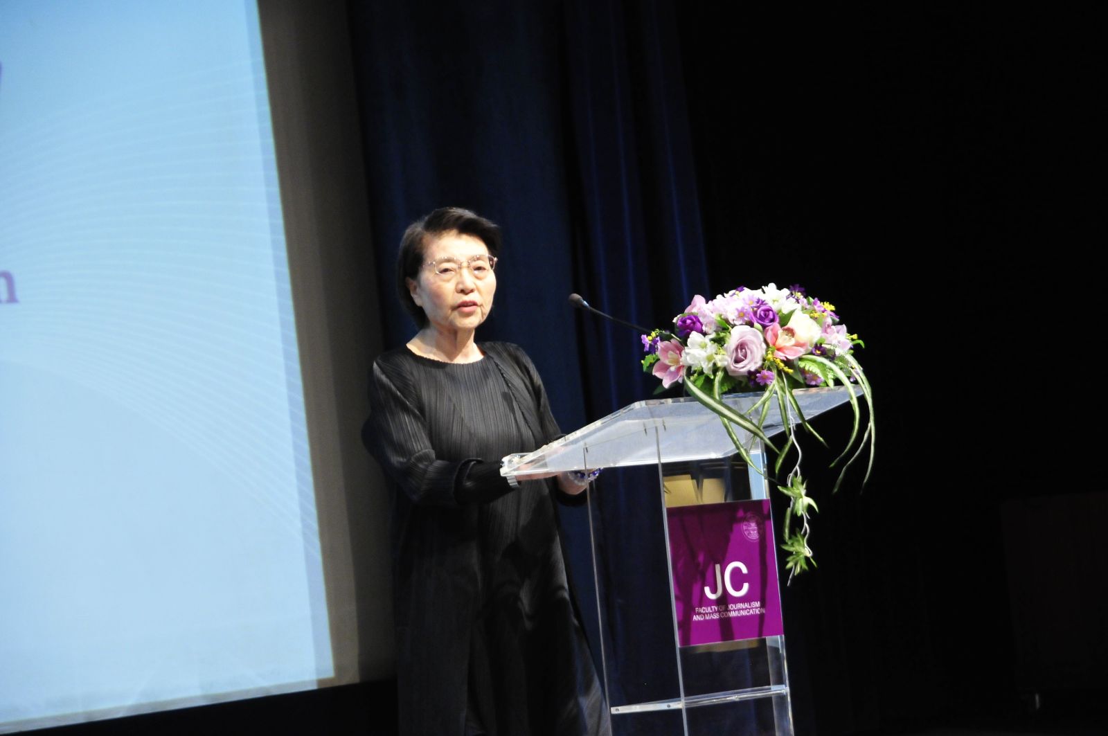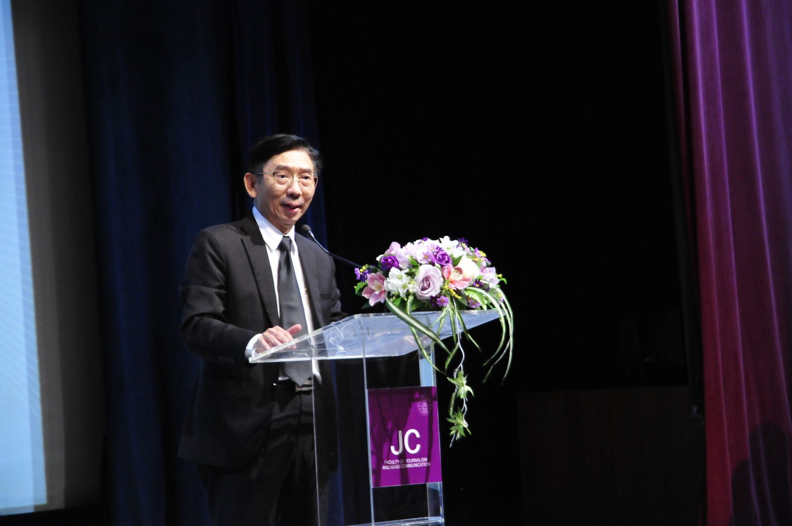 ศ.ดร.สมคิด เลิศไพฑูรย์ อดีตอธิบการบดี มธ. กล่าวเปิดในพิธีมอบทุน ณ โรงภาพยนตร์คณะวารสารศาสตร์ฯ มธ. รังสิต