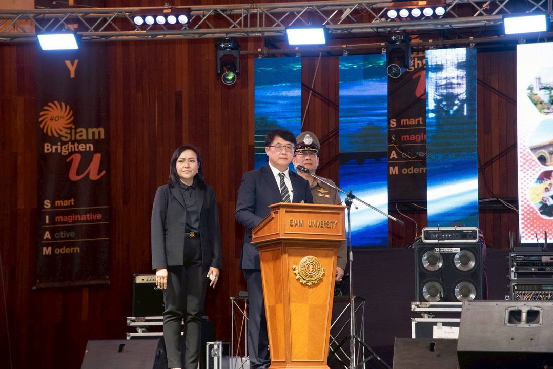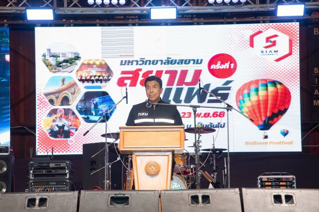 โอกาสนี้ ผู้ว่าฯ ชัชชาติ ได้กล่าวขอบคุณมหาวิทยาลัยสยามและภาคีเครือข่ายที่ได้ร่วมกันจัดงานสยามแฟร์ ครั้งที่ 1 เพราะเป็นการช่วยส่งเสริมการมีพื้นที่ขายสินค้าให้กับผู้ค้า และเป็นการช่วยกระตุ้นเศรษฐกิจ อยากให้มีการจัดงานแบบนี้บ่อย ๆ ซึ่งการจัดงานในครั้งนี้มีร้านค้าเป็นจำนวนมาก มีของกิน ของอร่อยมากมาย หากภาคเอกชนร่วมมือร่วมใจกันจัดพื้นที่ให้ประชาชน หรือ SME ที่อยู่ในภาคี ได้มีพื้นที่ขายของในราคาไม่แพงจะช่วยให้มีการสร้างรายได้หมุนเวียนในระบบเศรษฐกิจได้ ส่วนการจัดงานสยามนิทัศน์เป็นการส่งเสริมให้นักศึกษาได้ประสบการณ์จริงจากการเรียนการสอนซึ่งเป็นหัวใจสำคัญของการเรียนรู้ ขอให้การจัดงานในครั้งนี้ประสบความสำเร็จ มีครั้งที่ 2 ครั้งที่ 3 ต่อไปเรื่อย เพื่อช่วยให้ผู้ค้ามีพื้นที่ขายของเพิ่มขึ้น และขอให้ทุกคนช่วยกันพัฒนากรุงเทพมหานครให้เจริญยิ่งขึ้นต่อไป
