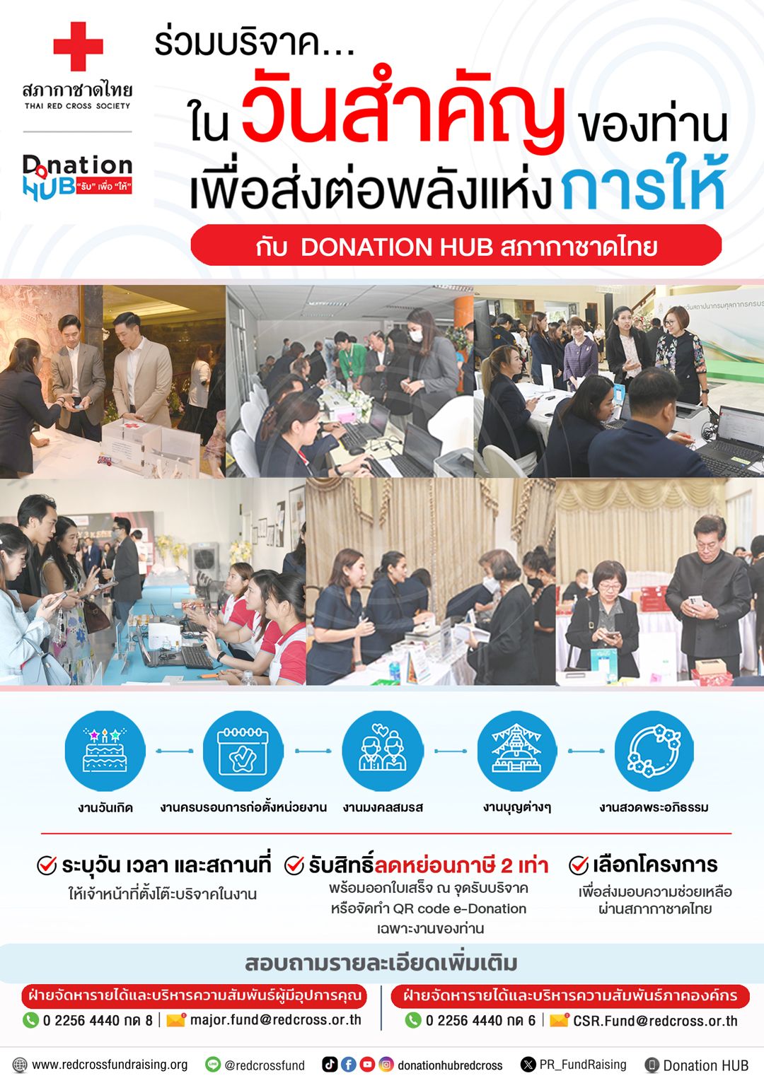 Donation HUB สภากาชาดไทย ในฐานะศูนย์รวมการบริจาคและจัดกิจกรรมหารายได้เพื่อสนับสนุนทุกภารกิจการช่วยเหลือของสภากา ชาดไทย เผยถึงความตั้งใจในการพัฒนาแพลตฟอร์มดิจิทัล เพื่อรองรับพฤติกรรมของผู้บริจาคในยุคดิจิทัล และเพิ่มประสิทธิภาพในการระดมทุน ควบคู่กับการจัดกิจกรรมการกุศลเพื่อหารายได้ อาทิ งานกาชาดประจำปี งานออกร้านคณะภริยาทูต งานกาชาดคอนเสิร์ต งานวิ่งการกุศล รวมไปถึงกิจกรรมระดมทุนรูปแบบใหม่ ๆ เพื่อร่วมเป็นส่วนหนึ่งในการขับเคลื่อนภารกิจด้านมนุษยธรรมของสภากาชาดไทย ปี 2569 ตั้งเป้าระ ดมทุน 1,020 ล้านบาท ขับเคลื่อนทุกภารกิจการช่วยเหลือเต็มกำลัง