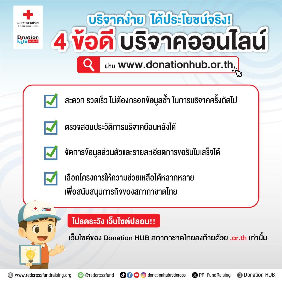 ทั้งนี้ แอปพลิเคชัน DONATIONHUB ส่งต่อทุกการให้ครบจบในแอปเดียว เพิ่มความสะดวกสบายให้กับผู้บริจาคสามารถเลือกโครงการที่ต้อง การบริจาค ขอรับใบเสร็จรับเงินบริจาคในรูปแบบอิเล็กทรอนิกส์ และตรวจสอบสิทธิประโยชน์ของการเป็นผู้มีอุปการคุณสภากาชาดไทย รวมถึงติดตามข่าวสารต่าง ๆ จากสภากาชาดไทย ปัจจุบันทั้ง 2 ช่องทางได้เปิดให้บริการมากว่า 2 ปีแล้ว นอกจากนี้ ปี 2568 เรายังได้พัฒนา www.iredcross.org เป็นแพลตฟอร์มการจัดหารายได้การกุศลทางดิจิทัลของสภากาชาดไทย เพื่อเสริมทัพการระดมทุนออนไลน์ในรูปแบบของแพลตฟอร์ม Donatainment ดูแลทุกการแบ่งปัน เชื่อมต่อผู้บริจาคกับกิจกรรมพิเศษต่าง ๆ ของสภากาชาดไทย อาทิ งานกาชาดออน ไลน์ การจำหน่ายของที่ระลึก การระดมทุนร่วมกับศิลปินดารา โดยเปิดโอกาสให้ประชาชนร่วมบริจาคผ่านการเลือกซื้อสินค้าหรือเข้าร่วมกิจ กรรมการกุศลออนไลน์ รวมถึงการจัดกิจกรรม CSR รูปแบบใหม่ ๆ สำหรับภาคองค์กร โดยแต่ละแพลตฟอร์มมีความโดดเด่นที่แตกต่าง แต่เสริมกันอย่างลงตัว ทั้งหมดนี้ เพื่อเพิ่มความแข็งแกร่งในการระดมทุนอย่างรวดเร็ว และตอบสนองต่อสถานการณ์ฉุกเฉินได้อย่างทันท่วงที”
