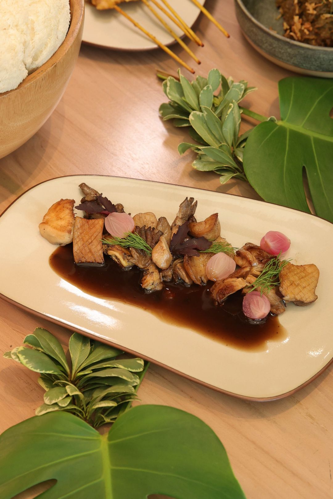 ถัดมาที่ “ป่าดิบชื้น” หรือป่าฝนเขตร้อนที่อุดมไปด้วยผลไม้และสมุนไพรนานาชนิด ถูกตีความผ่านเมนู Ayam Penyet Grilled Chicken ไก่ย่างเนื้อนุ่มราดซอสน้ำพริกสูตรเผ็ดกลมกล่อม เสิร์ฟพร้อมสลัดผลไม้สดอย่างชมพู่, ลิ้นจี่ และส้มมะปิ๊ด ที่มอบรสหวานอมเปรี้ยวชวนสดชื่น และ Rujak Salad สลัดผลไม้ราดน้ำราดสมุนไพรเข้มข้น สะท้อนความเปรี้ยวจัดและหวานมันในแบบเอเชียตะวันออกเฉียงใต้ได้อย่างลงตัว