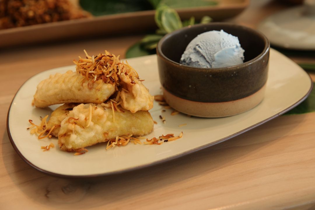นอกจากเมนูจานหลักที่ชวนประทับใจแล้ว “Gaya” (กายา) ยังรังสรรค์ของหวานแสนละเมียดละไม อาทิ แพนนาคอตต้ามะพร้าว ที่ใช้กะทิสดแทนนม ให้รสสัมผัสเนียนนุ่มและหอมมันแบบธรรมชาติ และ กล้วยทอดไอศกรีมมะพร้าวอ่อนอัญชัน กล้วยทอดสีทองราดซอสคาราเมล เสิร์ฟคู่ไอศกรีมมะพร้าวอ่อนอัญชันรสละมุน สร้างความสมดุลระหว่างความอุ่นและความเย็นได้อย่างลงตัว