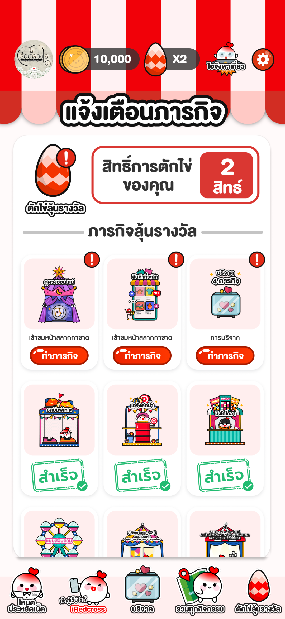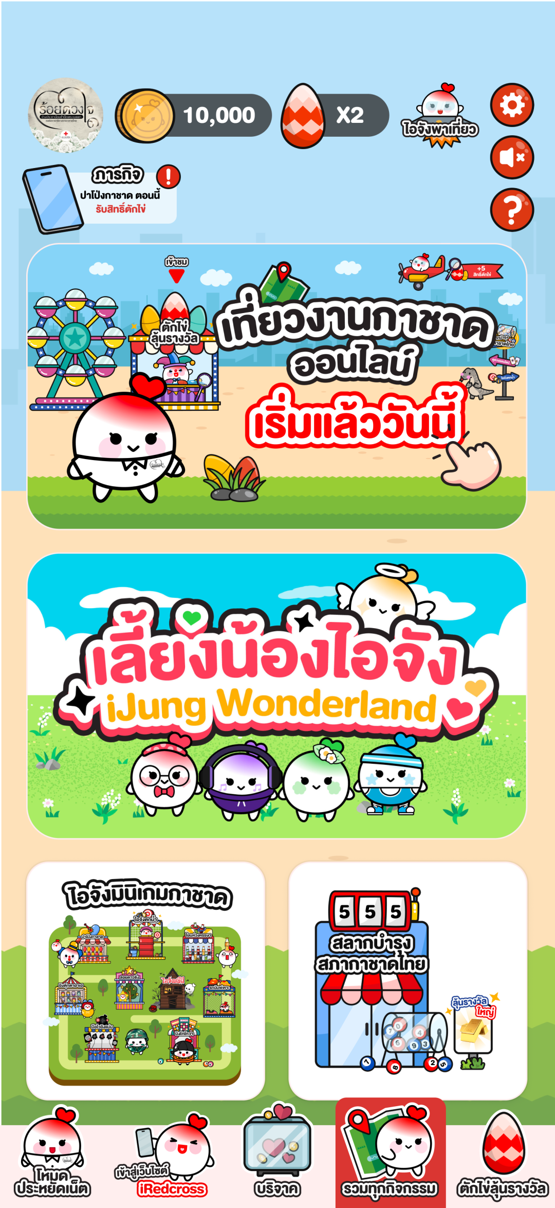 สำหรับ งานกาชาดออนไลน์ที่แพลตฟอร์ม iRedcross พบกับน้องไอจังพาเที่ยวงานกาชาดออนไลน์ สัมผัสความรู้สึกเต็มอิ่มเหมือนได้มาเดินเที่ยวงานกาชาดจริง ผ่านหน้าจอมือถือ อาทิ นิทรรศการออนไลน์ “69 ปี แสงแห่งพระเมตตา องค์สภานายิกาสภากาชาดไทย” การจำหน่ายสินค้าจากร้านโครงการส่วนพระองค์ และเหล่ากาชาดจังหวัด การจำหน่ายสลากกาชาดออนไลน์ 11 หน่วยงาน การตรวจดวงชะตาพยากรณ์ออนไลน์ กิจกรรมเกมตักไข่ลุ้นโชค มินิเกมกาชาด กิจกรรมปาเป้า และไอจังตกน้ำ พร้อมร่วมทำบุญผ่านการบริจาคออนไลน์สนับสนุนภารกิจสภากาชาดไทย
