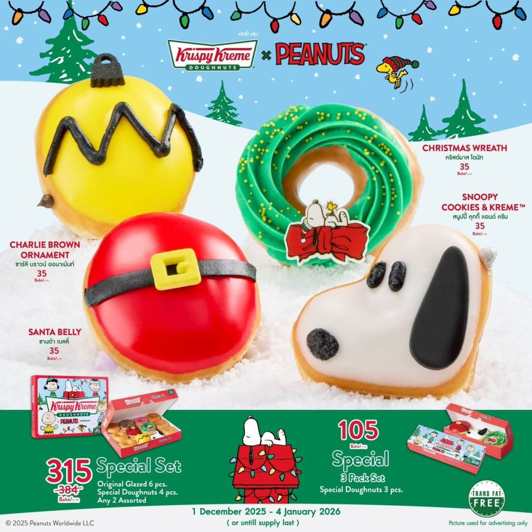 เติมเต็มบรรยากาศแห่งความสุขส่งท้ายปีกับ “Krispy Kreme x Peanuts™ Christmas Doughnuts” ในราคาเพียง ชิ้นละ 35 บาท หรือจะเลือกซื้อแบบเซตที่มาพร้อมกล่องลายลิมิเต็ดทั้งแบบแพ็ก 3 ในราคา 105 บาท (คริสต์มาส โดนัท 3 ชิ้น) หรือแบบเซต ในราคาเพียง 315 บาท (คริสต์มาส โดนัท 4 ชิ้น, แอสซอร์ทเตท 2 ชิ้น และออริจินอล เกลซ 6 ชิ้น) ตั้งแต่วันที่ 1 ธันวาคม 2568 – 4 มกราคม 2569 ณ ร้านคริสปี้ ครีม ทุกสาขาใกล้บ้านคุณ (ราคาดังกล่าว ยกเว้น สาขาสนามบินสุวรรณภูมิ, สนามบินดอนเมือง และแอปพลิเคชัน ฟู้ดดิลิเวอรี)พร้อมติดตามความเคลื่อนไหวของ คริสปี้ ครีม โดนัท สุดโปรดของคุณได้ที่ www.krispykreme.co.th , www.facebook.com/krispykremethailandfanpage หรือ #Krispykremethailand