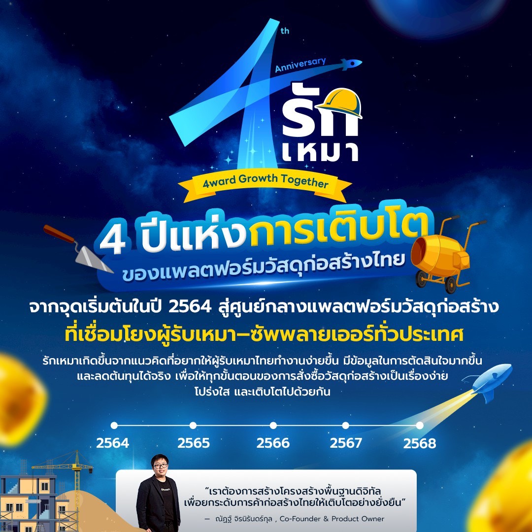 “รักเหมา” แพลตฟอร์มดิจิทัลด้านวัสดุก่อสร้างของไทย เฉลิมฉลองครบรอบ 4 ปีแห่งการเติบโต ภายใต้แนวคิด “4WARD Growth Together” สื่อถึงการก้าวไปข้างหน้าอย่างมั่นคงร่วมกับผู้รับเหมาไทยและเครือข่ายร้านค้าวัสดุก่อสร้าง ด้วยเทคโนโลยีที่ “ฉลาดขึ้น ง่ายขึ้น ประหยัดขึ้น และไวขึ้น (Smarter, Simpler, Saver, Speed)” ตอกย้ำจุดยืนของแบรนด์ในฐานะ “เพื่อนคู่คิดของทั้งผู้รับเหมาและเครือข่ายผู้ขายวัสดุก่อสร้างไทย” ที่มุ่งสร้างระบบนิเวศการก่อสร้างแบบสองฝั่งให้เติบโตอย่างยั่งยืนไปด้วยกัน คาดมูลค่าการซื้อ-ขายผ่านแพลตฟอร์ม (GMV) ปี 2568 จะมีมูลค่า 1,380 ล้านบาท เติบโตกว่า 30%