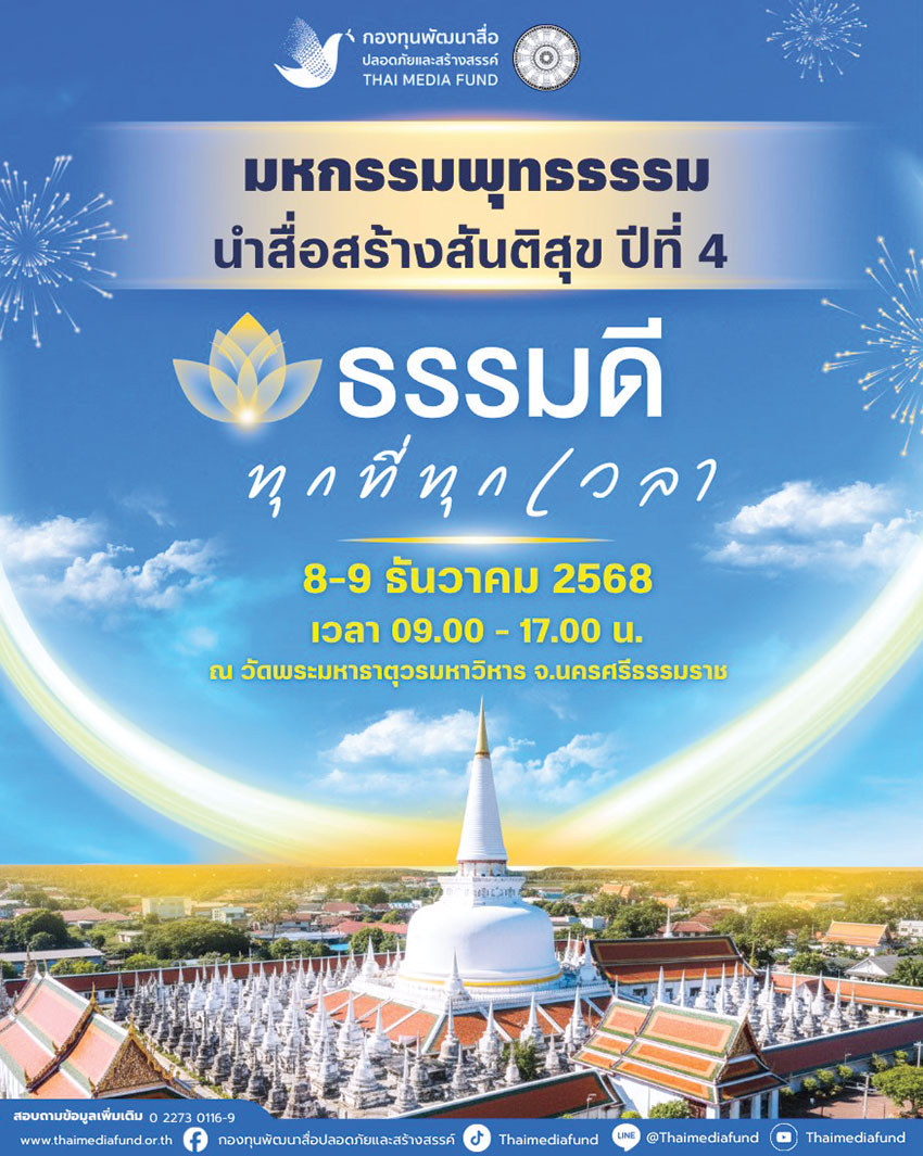 หากคุณเป็นผู้หนึ่งที่สนใจในพุทธธรรม สื่อสร้างสรรค์ รวมถึงวัฒนธรรมภาคใต้ ขอเชิญชวนให้เข้าร่วมงาน “มหกรรมพุทธธรรมนำสื่อสร้างสันติสุข ปีที่ 4” ได้ในวันที่ 8-9 ธันวาคมนี้ ณ วัดพระมหาธาตุวรมหาวิหาร จังหวัดนครศรีธรรมราช โดยผู้ที่สนใจสามารถสอบถามเพิ่มเติมได้ที่โทรศัพท์ 064-264-9191 (ณัฐนันท์) หรือติดตามข้อมูลและประกาศต่างๆ ได้ที่ www.thaimediafund.or.th หรือ Facebook: กองทุนพัฒนาสื่อปลอดภัยและสร้างสรรค์ และ Line / TikTok: @thaimediafund