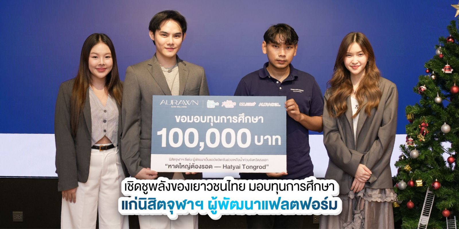 ในขณะเดียวกัน Aura Wellness ยังได้ร่วมสนับสนุน นิสิตจุฬาลงกรณ์มหาวิทยาลัย ผู้พัฒนาแพลตฟอร์ม “หาดใหญ่ต้องรอด” ซึ่งเป็นระบบแจ้งเหตุและขอความช่วยเหลือแบบเรียลไทม์จากประชาชนในพื้นที่ แพลตฟอร์มนี้เป็นผลงานของเยาวชนที่ต้องการช่วยเหลือสังคมในช่วงวิกฤต และองค์กรมีความภาคภูมิใจที่ได้เป็นส่วนหนึ่งในการผลักดันศักยภาพของคนรุ่นใหม่ที่ใช้เทคโนโลยีเพื่อประโยชน์ของส่วนรวม โดยได้มอบทุนการศึกษารวม 100,000 บาท ให้แก่นายพัชรศิริ สีชาติ นิสิตจุฬาลงกรณ์มหาวิทยาลัย ผู้พัฒนาแพลตฟอร์ม “หาดใหญ่ต้องรอด” ภายในเวลาเพียง 3 ชั่วโมง แต่กลายเป็นศูนย์กลางข้อมูลที่ช่วยให้การช่วยเหลือคนในพื้นที่ทำได้เร็วขึ้น และมีประสิทธิภาพยิ่งขึ้น
