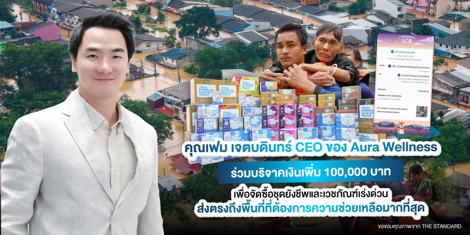 นอกจากนี้ เฟม - เจตบดินทร์ ประคุณศึกษาพันธ์ CEO ของ Aura Wellness ได้ร่วมบริจาคเงินเพิ่มเติมอีก 100,000 บาท เพื่อจัดซื้อชุดยังชีพและเวชภัณฑ์เร่งด่วน ส่งตรงถึงพื้นที่ที่ต้องการความช่วยเหลือมากที่สุด เหตุการณ์ครั้งนี้สะท้อนให้เห็นว่า ความรับผิดชอบต่อสังคมเกิดจากการลงมือทำอย่างจริงใจและต่อเนื่อง ซึ่ง Aura Wellness แสดงให้เห็นผ่านการดูแลพนักงานของตนเอง การยื่นมือช่วยเหลือชุมชน และการลงทุนในพลังของเยาวชนผู้สร้างสรรค์นวัตกรรมเพื่อสังคม การสนับสนุนรวมกว่า 400,000 บาท ไม่เพียงบรรเทาความเดือดร้อนในวันนี้ แต่ยังช่วยวางรากฐานให้พื้นที่และประเทศมีระบบรับมือภัยพิบัติที่ดีขึ้นในอนาคต
