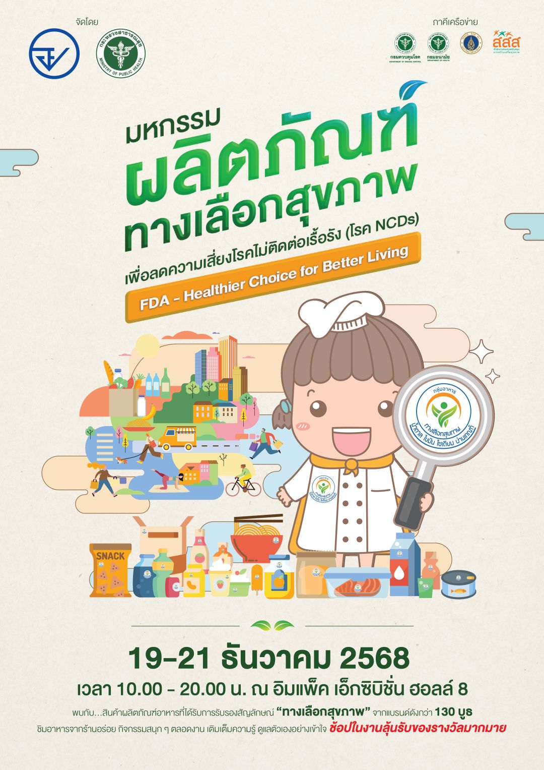 งานมหกรรมผลิตภัณฑ์ทางเลือกสุขภาพ (Healthier Choice Expo) ที่ อย. ตั้งใจจัดขึ้นในระหว่างวันที่ 19-21 ธันวาคม 2568 ณ อิมแพ็ค เอ็กซิบิชั่น ฮอลล์ 8 เมืองทองธานี เพื่อให้ประชาชนเข้าถึงข้อมูลสุขภาพที่ถูกต้อง และเลือกซื้อผลิตภัณฑ์อาหารที่ดีต่อสุขภาพได้ง่ายขึ้น ผ่านสัญลักษณ์โภชนาการ ‘ทางเลือกสุขภาพ’ ซึ่งเป็นตัวช่วยสำคัญในการตัดสินใจเลือกผลิตภัณฑ์ที่ผ่านการตรวจสอบแล้วว่า มีปริมาณน้ำตาล ไขมัน และโซเดียม อยู่ในเกณฑ์ที่เหมาะสม งานนี้จึงเป็นอีกก้าวหนึ่งในการร่วมกันสร้างสังคมไทยที่แข็งแรง ลดความเสี่ยงการเกิดโรค NCDs และยกระดับคุณภาพชีวิตของประชาชน