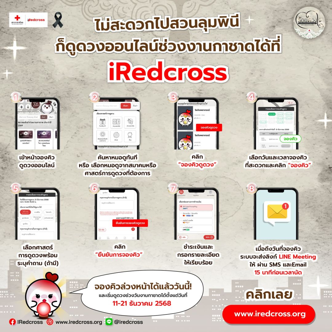ผู้ที่สนใจกิจกรรมดูดวงออนไลน์สามารถจองคิวล่วงหน้ากับหมอดูผู้เชี่ยวชาญได้แล้วตั้งแต่วันนี้ และจะเปิดให้บริการระหว่างวันที่ 11–21 ธันวา คม 2568 เท่านั้น สามารถติดตามรายละเอียดกิจกรรมทั้งหมดได้ทาง www.iredcross.org