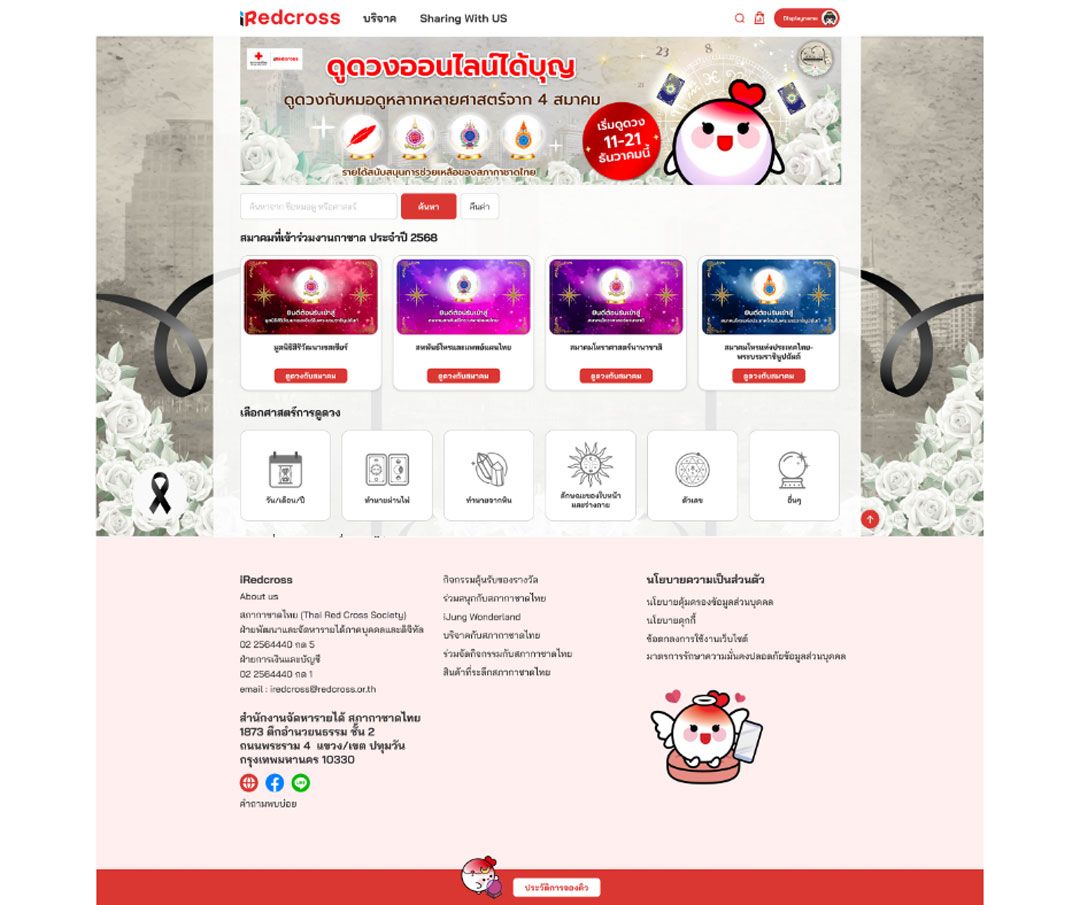 แพลตฟอร์ม iRedcross ไม่เพียงเปิดให้ร่วมกิจกรรมดูดวงออนไลน์เท่านั้น แต่ยังยกระดับประสบการณ์งานกาชาดในรูปแบบดิจิทัลให้ครบถ้วนยิ่งขึ้น ผ่านการเที่ยวงานกาชาดออนไลน์ตลอด 24 ชั่วโมงกับ “น้องไอจัง” มาสคอตประจำแพลตฟอร์ม ที่จะพาผู้เข้าชมเยี่ยมชมร้านค้าและกิจกรรมเสมือนจริงหลากหลาย ไม่ว่าจะเป็นนิทรรศการออนไลน์ “69 ปี แสงแห่งพระเมตตา องค์สภานายิกาสภากาชาดไทย” ร้านโครงการส่วนพระองค์ ร้านค้าจากเหล่ากาชาดจังหวัดกว่า 297 ร้าน และผลิตภัณฑ์จาก 40 โรงเรียน พร้อมทั้งการจำหน่ายสลากกาชาดออนไลน์จาก 11 หน่วยงาน กิจกรรมสนุกสไตล์งานกาชาด เช่น ตักไข่ลุ้นโชค มินิเกมกาชาด ปาเป้า และเกม “ไอจังตกน้ำ” รวมถึงโซนสินค้าที่ระลึกของสภากาชาดไทยและช่องทางทำบุญออนไลน์ ช่วยให้ประชาชนสามารถเพลิดเพลินกับงานกาชาดและร่วมสนับสนุนภารกิจของสภากาชาดไทยได้อย่างสะดวกครบจบในแพลตฟอร์มเดียว