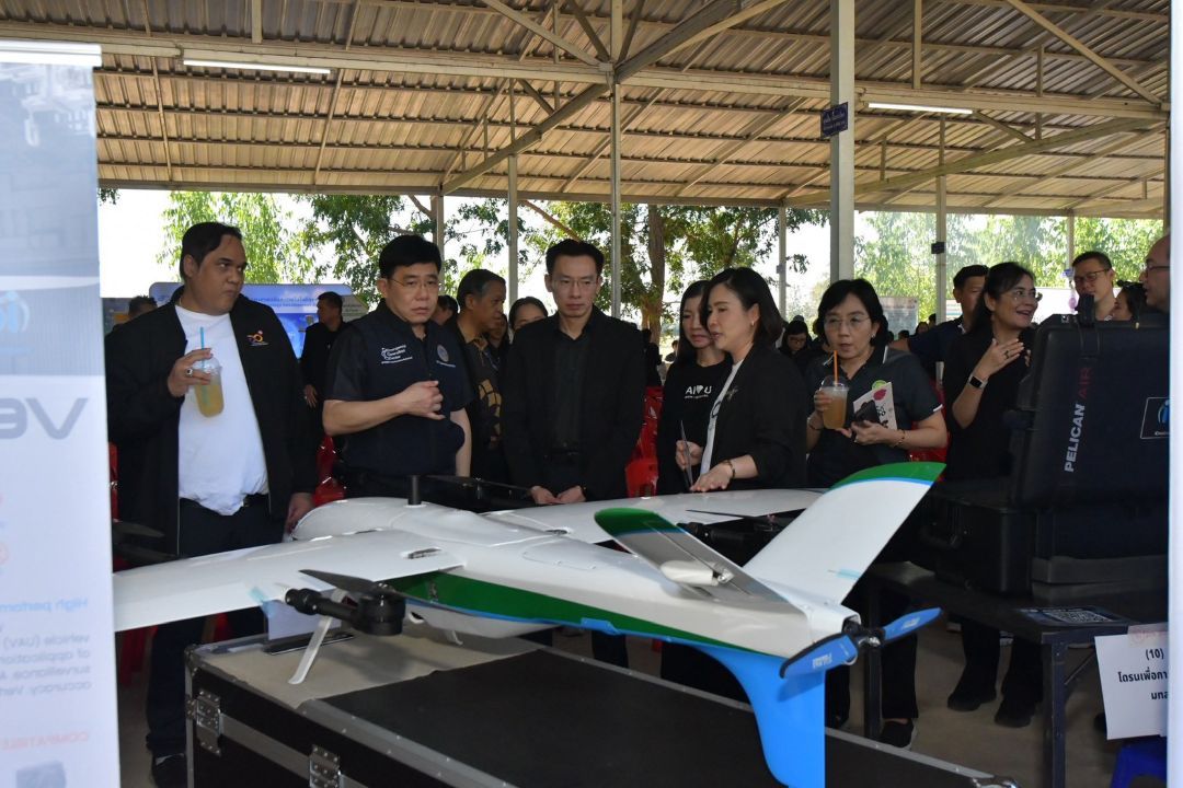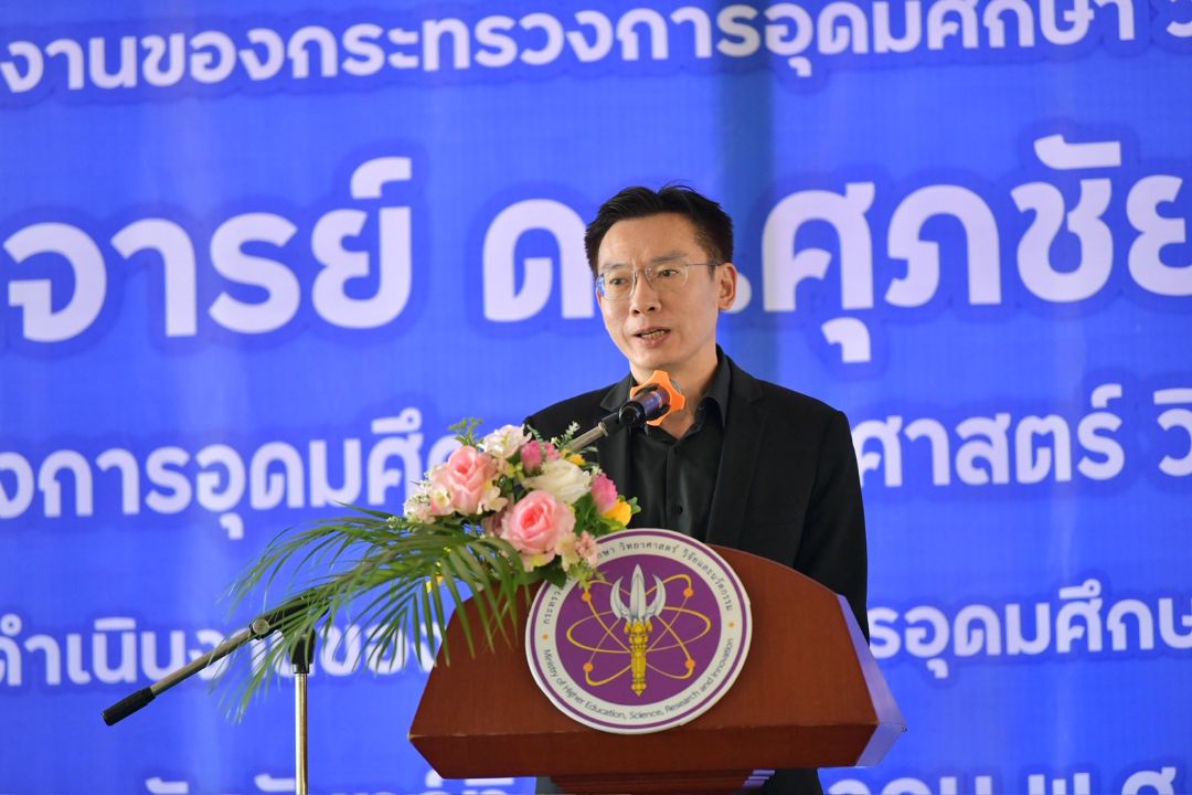 ศ.ดร.ศุภชัย กล่าวเปิดงานว่า กระทรวง อว. มีมหาวิทยาลัยในการดูแลถึง 154 แห่งทั่วประเทศ เฉพาะจังหวัดนครราชสีมาก็มีหลายแห่ง อาทิ มหาวิทยาลัยเทคโนโลยีสุรนารี(มทส.) มหาวิทยาลัยราชภัฎฺ(มรภ.) นครราชสีมา มหาวิทยาลัยราชงคล(มทร.)อีสานรวมทั้งหน่วยงานวิจัยอีกหลายแห่งที่จะมาช่วยพี่น้องประชาชนโดยการนำ อววน.มาช่วยทั้งด้านเกษตร อุตสาหกรรม อาชีพ สุขภาพ การพัฒนาทักษะอาชีพให้กับประชาชนในพื้นที่ โดยตลอดสองเดือนที่ผ่านมา กระทรวง อว.ได้ขับเคลื่อนนโยบาย Quick Win เพื่อสร้างผลลัพธ์ที่ประชาชนจับต้องได้อย่างรวดเร็ว ครอบคลุม 5 ด้านสำคัญ กลุ่มแรก “วิจัยติดดิน กินได้” โครงการ “โดรนคนละครึ่งพลัส สู่สมาร์ทฟาร์มมิ่ง” ที่ช่วยเกษตรกรลดต้นทุน ลดแรงงาน ลดเวลา และลดความเสี่ยงจากสารเคมี เป็นการนำนวัตกรรมลงสู่ไร่นาอย่างแท้จริง กลุ่มที่สอง “วิทย์พิชิตภัย” นำเทคโนโลยีชั้นสูง ทั้งดาวเทียม THEOS ระบบThaiWater และ GeoAI มาตรวจจับ ชี้พิกัด และเตือนภัยน้ำท่วมได้อย่างแม่นยำ พร้อมบูรณาการการช่วยเหลือผ่านระบบ Traffy Fondue เพื่อให้ประชาชนได้รับการดูแลอย่างทั่วถึงไม่ตกหล่น