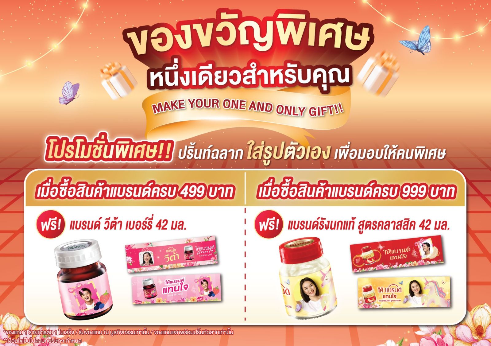 เมื่อซื้อสินค้าแบรนด์ครบ 499 บาท ฟรีแบรนด์วีต้าเบอรี่ 42 มล. พร้อมพิมพ์ฉลากที่สามารถใส่รูปตัวเองได้ (ถ่ายรูปหน้าบูท) เพื่อมอบให้คนพิเศษ และเมื่อซื้อสินค้าแบรนด์ครบ 999 บาท ฟรีแบรนด์รังนกแท้ 42 มล. พร้อมพิมพ์ฉลากที่สามารถใส่รูปตัวเองได้ (ถ่ายรูปหน้าบูท) เพื่อมอบให้คนพิเศษ Lucky Wheel เมื่อซื้อสินค้าแบรนด์ครบ 999 บาท รับสิทธิ์ร่วมกิจกรรมวงล้อลุ้นรางวัล มูลค่าสูงสุด 490 บาท
