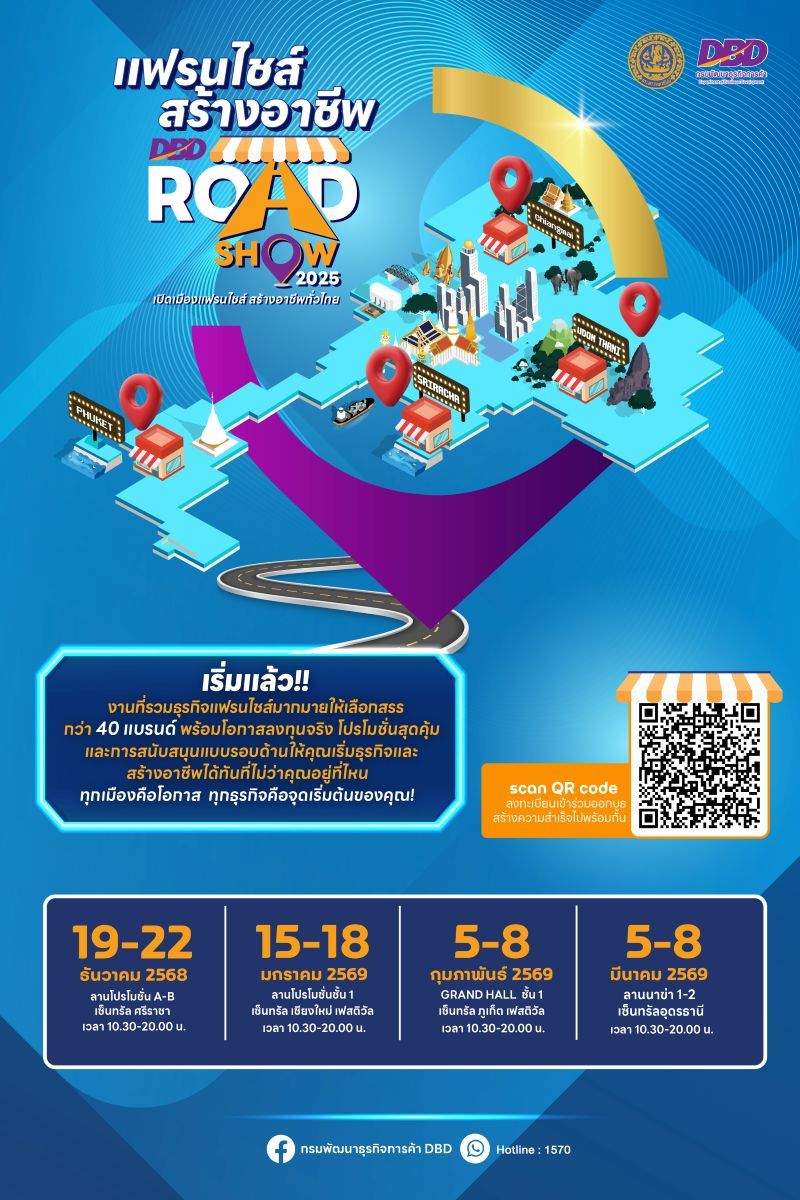 นายพูนพงษ์ นัยนาภากรณ์ อธิบดีกรมพัฒนาธุรกิจการค้า กระทรวงพาณิชย์ เผยว่า กรมฯ ให้ความสำคัญกับการยกระดับธุรกิจแฟรนไชส์ไทยให้เติบโตอย่างเป็นระบบและยั่งยืน โดยเฉพาะการสนับสนุนผู้ประกอบการและประชาชนในส่วนภูมิภาคให้สามารถเข้าถึงข้อมูล ความรู้ และโอกาสทางการค้าอย่างเท่าเทียม สอดรับตามนโยบาย Quick Big Win ด้านการเสริมแกร่งผู้ประกอบการ SMEs และเพิ่มมูลค่าสินค้าไทย ของรัฐมนตรีว่าการกระทรวงพาณิชย์ (นางศุภจี สุธรรมพันธุ์) โดยระหว่างเดือนธันวาคม 2568 - มีนาคม 2569 กรมเตรียมจัดกิจกรรมแฟรนไชส์ Roadshow จำนวน 4 ครั้ง ใน 4 ภูมิภาค โดยคัดเลือกธุรกิจแฟรนไชส์ที่ผ่านเกณฑ์มาตรฐาน DBD Franchise Standard 2025 เข้าร่วมโรดโชว์ ประกอบด้วย ครั้งที่ 1 วันที่ 19-22 ธันวาคม 2568 เซ็นทรัลศรีราชา ครั้งที่ 2 วันที่ 15-18 มกราคม 2569 เซ็นทรัลเชียงใหม่ เฟสติวัล ครั้งที่ 3 วันที่ 5-8 กุมภาพันธ์ 2569 เซ็นทรัลภูเก็ต เฟสติวัล และครั้งที่ 4 วันที่ 5-8 มีนาคม 2569 เซ็นทรัลอุดรธานี เพื่อเปิดเวทีให้ผู้สนใจในจังหวัดและพื้นที่ใกล้เคียง ได้พบปะเจ้าของแฟรนไชส์โดยตรงและเจรจาธุรกิจ พร้อมเรียนรู้ข้อมูลธุรกิจอย่างครบวงจร
