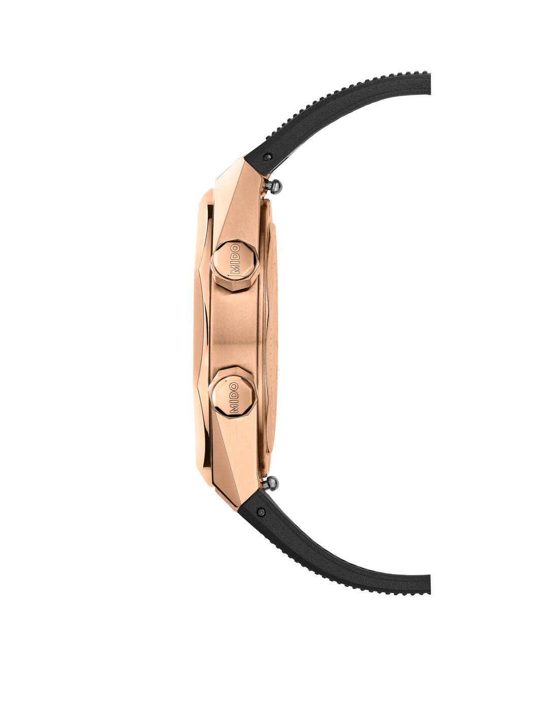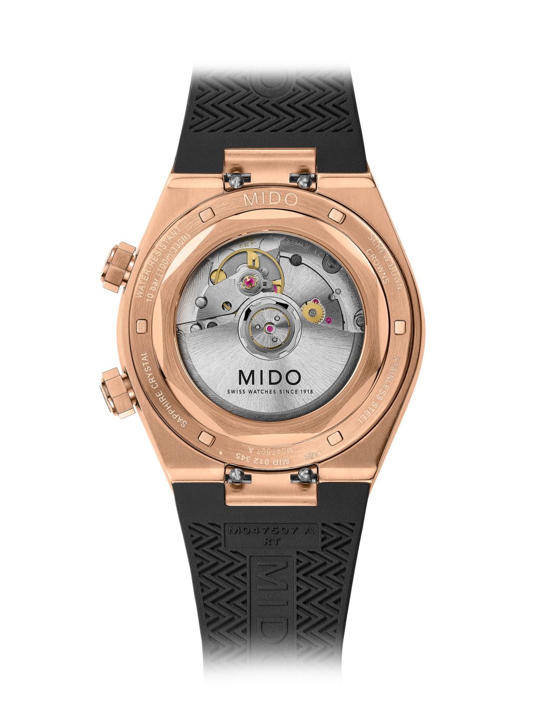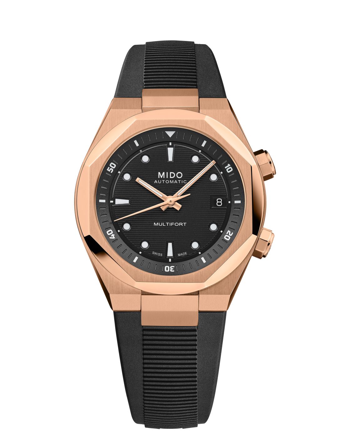 สำหรับ มัลติฟอร์ท 8 ทู คราวน์ (Multifort 8 Two Crowns) เฉดใหม่นี้ เป็นเรือนเวลาที่ผสานความงามและความแม่นยำไว้ด้วยกันอย่างสมบูรณ์แบบ ด้วยหน้าปัดขนาด 40 มิลลิเมตร ที่สะกดทุกสายตาด้วยกรอบตัวเรือนเรขาคณิตทรงแปดเหลี่ยมในโทนสีโรสโกลด์ตัดกับพื้นหน้าปัดสีดำด้าน ตกแต่งด้วยลวดลายเส้นแนวนอน เสริมความแข็งแแกร่งด้วยตัวเรือนที่ทำจากสแตนเลสสตีลขัดซาตินและขัดเงา พร้อมเคลือบ PVD สีโรสโกลด์ที่ช่วยเพิ่มความเปล่งประกายอย่างมีระดับ และครอบด้วยกระจกคริสตัลแซฟไฟร์ที่เคลือบสารกันการสะท้อนทั้งด้านในและด้านนอกเพื่อความคมชัดในการอ่านค่า มาพร้อมขอบด้านในแบบหมุนได้ที่เกิดจากการทำงานของเม็ดมะยมที่ตำแหน่ง 2 นาฬิกา ซึ่งถูกออกแบบมาเฉพาะเป็นทรงแปดเหลี่ยมเคลือบด้วย PVD สีโรสโกลด์เข้ากันอย่างลงตัวกับตัวเรือน โดยเม็ดมะยมถูกติดตั้งไว้ 2 ตำแหน่ง ที่บริเวณตำแหน่ง 2 นาฬิกา ใช้ตั้งขอบหน้าปัดด้านในที่หมุนได้สำหรับใช้นับเวลาถอยหลัง และตำแหน่ง 4 นาฬิกา สำหรับตั้งเวลาและขึ้นลาน โดยรุ่นนี้มาพร้อมกับเข็มชั่วโมงและเข็มนาทีที่ใช้เทคนิคการขัดซาตินบริเวณร่องตรงกลาง ช่วยเพิ่มมิติให้กับหน้าปัดและอ่านค่าได้แม่นยำยิ่งขึ้น พร้อมเคลือบด้วยสารเรืองแสงซูเปอร์ลูมิโนวา (Super-luminova®) สีขาว เพื่อการอ่านค่าเวลาที่สมบูรณ์แบบทั้งกลางวันและกลางคืน ควบคู่ไปกับเข็มวินาทีที่ถูกเจียระไนพร้อมเคลือบ PVD สีโรสโกลด์ โดยมีช่องหน้าต่างแสดงวันที่ (Date) บริเวณตำแหน่ง 3 นาฬิกา โดดเด่นด้วยดีไซน์ของหลักชั่วโมงที่เว้าลงไปในหน้าปัดช่วยสร้างมิติและดึงดูดสายตา มาพร้อมสายยางสีดำในลวดลายปั๊มนูนตัดกับขอบสีโรสโกลด์ได้อย่างลงตัว ในขณะเดียวกันด้วยระบบล็อกสายแบบบานพับทำให้สามารถถอดเปลี่ยนสายได้อย่างสะดวกสบาย นอกจากนี้ฝาหลังแบบเปลือยยังเผยให้เห็นกลไกการทำงานของตัวเรือนที่กำลังขับเคลื่อนด้วยกลไกคาลิเบอร์ 72 (Caliber 72) ที่สามารถสำรองพลังงานได้สูงสุดถึง 72 ชั่วโมง มาพร้อมบาลานซ์สปริงนิวาครอง (Nivachron™) ช่วยเสริมความทนทานต่อแรงกระแทกและสนามแม่เหล็กได้อย่างมีประสิทธิภาพ พร้อมสลักโลโก้ MIDO ที่สะท้อนความชำนาญด้านเรือนเวลาของ MIDO และยังสามารถในการกันน้ำลึกได้ถึง 100 เมตร