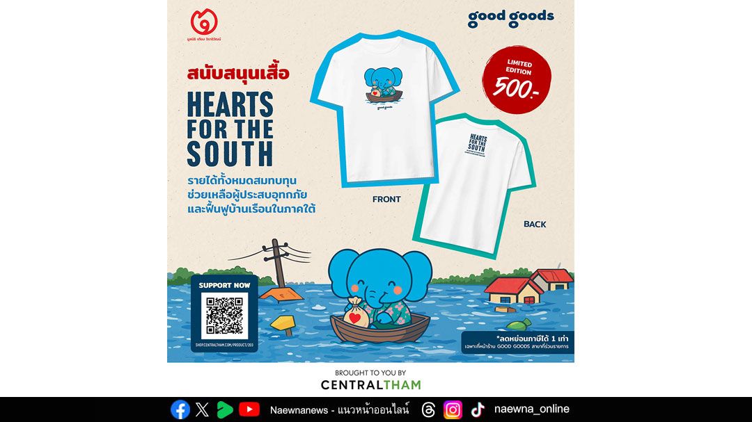 ทั้งนี้ ผู้ร่วมสนับสนุนทุกๆ 500 บาท จะได้รับ เสื้อยืด “Hearts For The South” 1 ตัว จากกุ๊ด กุ๊ดส์ เพื่อเป็นสัญลักษณ์แห่งการแบ่งปันและการมีส่วนร่วมในการช่วยเหลือสังคม ทั้งนี้ รายได้จากการสนับสนุนทั้งหมด ไม่หักค่าใช้จ่าย มอบให้แก่ มูลนิธิเตียง จิราธิวัฒน์ เพื่อนำไปจัดซื้อสิ่งจำเป็นและสนับสนุนการฟื้นฟูพื้นที่ประสบอุทกภัยหลังน้ำลด