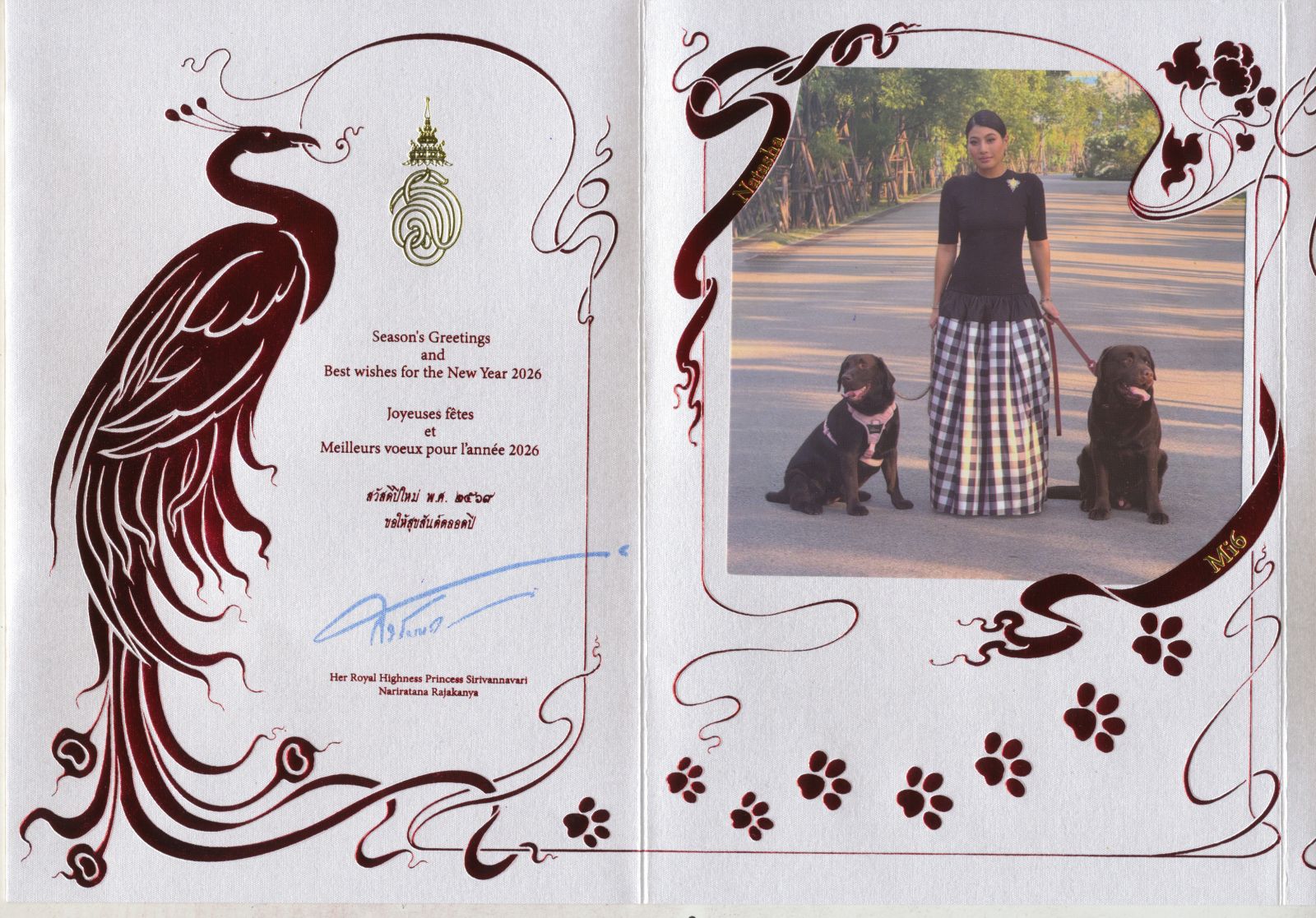 ภายในบัตรอวยพร ส.ค.ส. พระราชทาน ทางด้านซ้าย มีพระนาม สร. พร้อมข้อความอวยพร 3 ภาษา ได้แก่ ภาษาอังกฤษ Season’s Greetings and Best wishes for the New Year 2026 ภาษาฝรั่งเศส Joyeuses fêtes et Meilleurs voeux pour l’année 2026 และภาษาไทย “สวัสดีปีใหม่ พ.ศ.๒๕๖๙ ขอให้สุขสันต์ตลอดปี” โดยด้านล่างทรงลงพระนาม “สิริวัณณวรี” Her Royal Highness Princess Sirivannavari Nariratana Rajakanya ส่วนด้านขวาเป็นพระรูปของ สมเด็จพระเจ้าลูกเธอ เจ้าฟ้าสิริวัณณวรี นารีรัตนราชกัญญา จำนวน 3 พระรูปในพระอิริยาบถต่างๆ