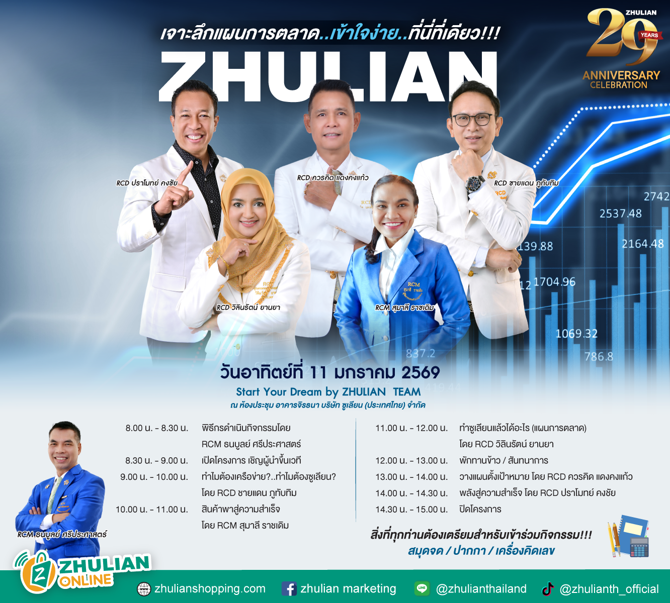 ต่อเนื่องด้วยเวทีไฮไลต์ “เจาะลึกแผนการตลาด เข้าใจง่าย ที่นี่ที่เดียว” ภายใต้ชื่อ ZHULIAN – Start Your Dream by ZHULIAN TEAM ซึ่งรวบรวมผู้นำระดับ RCD และ RCM มาร่วมถ่ายทอดประสบการณ์จริง กลยุทธ์การตลาดเชิงลึก และมุมมองการสร้างทีมธุรกิจในยุคปัจจุบัน ครอบคลุมตั้งแต่การตั้งเป้าหมาย การวางระบบ การขยายศักยภาพ ไปจนถึงการต่อยอดความสำเร็จอย่างยั่งยืน