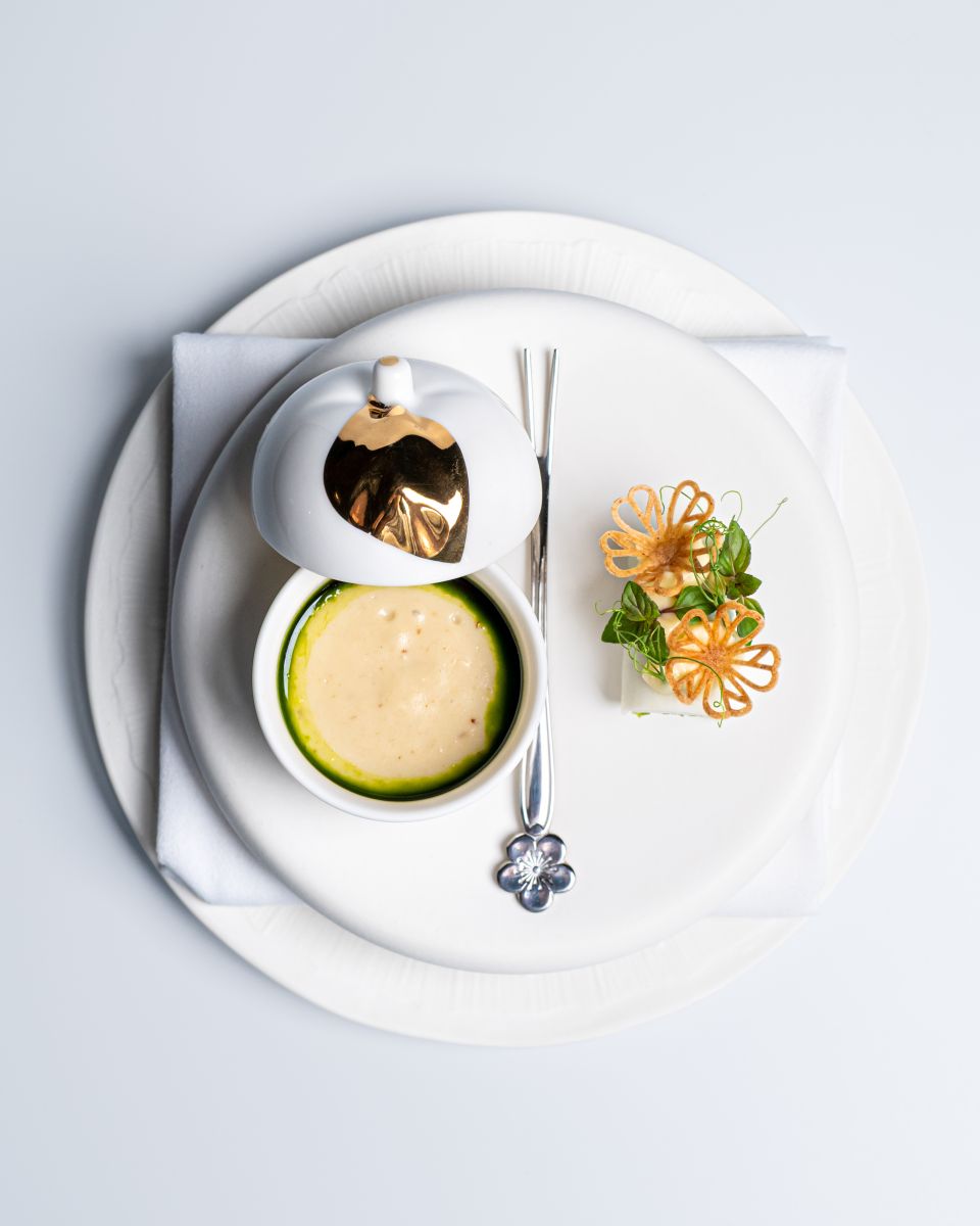เปิดสัมผัสแห่งฤดูกาลไปกับศิลปะบนจานอาหารที่นำเสนอเอกลักษณ์ของฤดูหนาว เริ่มจาก ‘Kansai Region Meji Maguro’ อัญมณีแห่งท้องทะเลคันไซ ที่ถูกยกระดับความหรูหราด้วยคาเวียร์ชั้นเลิศ ตัดกับรสสัมผัสจัดจ้านของโชริโซ (Chorizo) และไอศกรีมข้าวโพดที่มอบความเบาสบายอย่างน่าอัศจรรย์ ก่อนจะเข้าสู่ความเรียบง่ายที่แฝงด้วยความซับซ้อนในเมนู ‘Kohlrabi and Green Beans’ ที่ผสานความหวานกรอบของแอปเปิ้ลฟูจิเข้ากับมนต์เสน่ห์ของปลาไหลรมควันและสมุนไพรฤดูหนาว สะท้อนถึงความมุ่งมั่นในการปรุงแต่งที่คงไว้ซึ่งจิตวิญญาณแห่งธรรมชาติอย่างสมบูรณ์แบบ