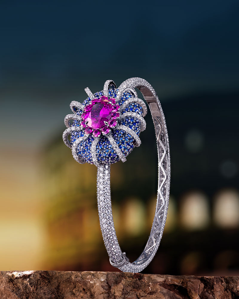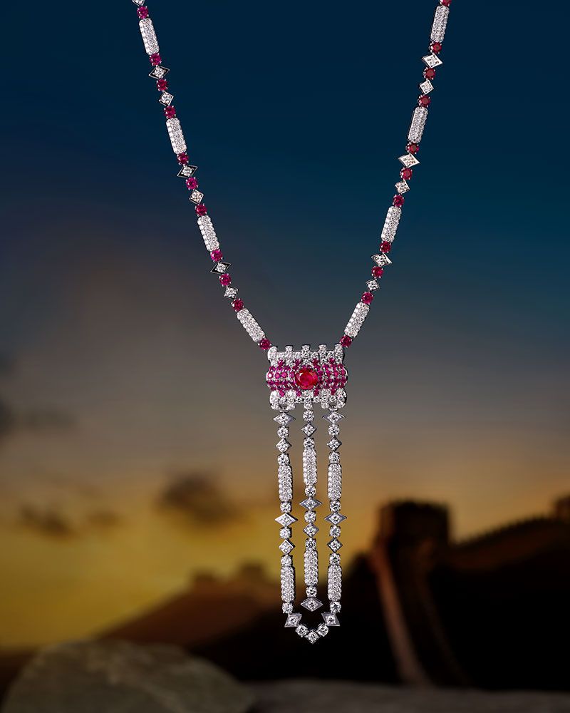 คอลเล็กชั่น Illuminated Wonders ประกอบด้วย 7 ชุดไฮจิวเวลรี โดยแต่ละชุดรังสรรค์เป็นเซ็ตสมบูรณ์ที่เข้าชุดกัน ทั้งสร้อยคอ สร้อยข้อมือ ต่างหู และแหวน เพื่อถ่ายทอดความงดงามของสถานที่ระดับตำนานของโลก ผ่านงานออกแบบอันวิจิตรและอัญมณีล้ำค่าที่คัดสรรอย่างเหนือระดับ ไม่ว่าจะเป็น Machu Picchu Suite — ลวดลายเรขาคณิตที่ประดับด้วยแซฟไฟร์สีน้ำเงินเข้ม ถ่ายทอดความสงบอันงดงามของยามสนธยาที่ปกคลุมเทือกเขาแอนดีส The Colosseum Suite — ซุ้มโค้งสีทองสะท้อนความยิ่งใหญ่เหนือกาลเวลาของกรุงโรม ภายใต้แสงยามเย็น Petra Suite — แซฟไฟร์สีชมพูและสีเหลืองสะท้อนเฉดสีแห่งหน้าผาหินทรายกุหลาบแดง ขณะต้องแสงสุดท้ายของวัน Chichen Itza Suite — แทนซาไนต์และแซฟไฟร์ถ่ายทอดแรงบันดาลใจจากการเรียงตัวของจักรวาล สู่ความกลมกลืนอันเปล่งประกาย Taj Mahal Suite — ภาพแทนแห่งความรักนิรันดร์ ผ่านโทนสีฟ้าและเขียวอันสงบนุ่มละมุน Great Wall of China Suite — ทับทิมแปรเปลี่ยนความแข็งแกร่งของศิลาสู่สัญลักษณ์แห่งพลังและแรงปรารถนา Legacy of Light Suite — ทัวร์มาลีนสีชมพูและแซฟไฟร์สีเหลืองถ่ายทอดช่วงเวลาการตื่นขึ้นของรุ่งอรุณ สื่อถึงการเริ่มต้นใหม่และความหวัง