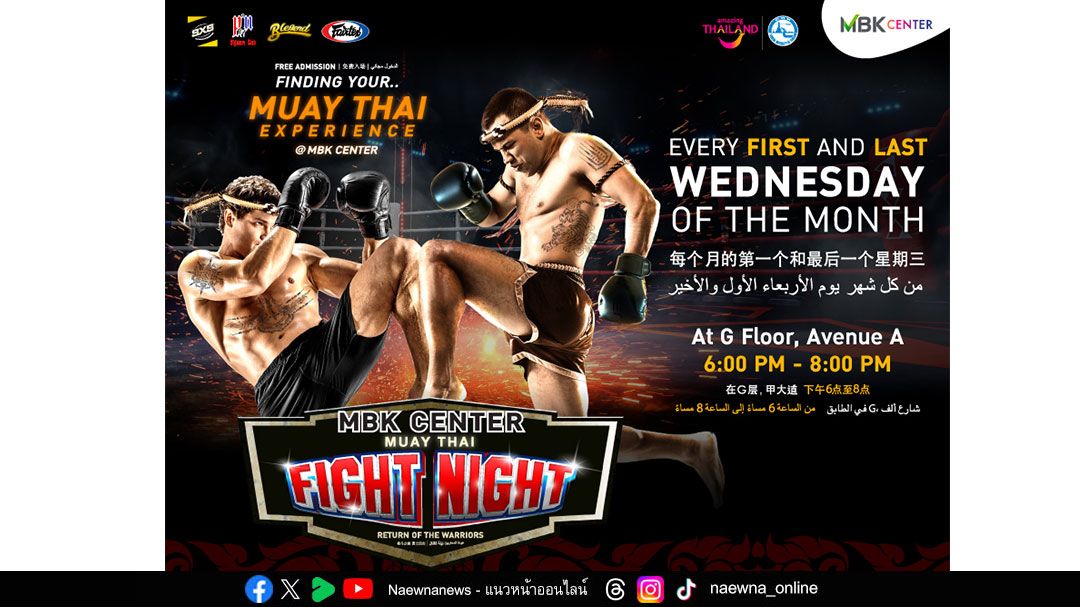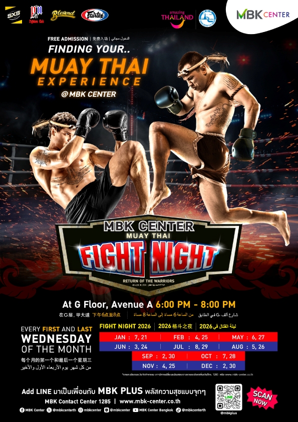 ศูนย์การค้าเอ็ม บี เค เซ็นเตอร์ สร้างสีสันและบรรยากาศความคึกคักใจกลางเมือง เดินหน้าส่งเสริม Soft Power ศิลปวัฒนธรรมไทยสู่สายตาทัวริสต์ในกิจกรรม MBK Center Muay Thai Fight Night มหกรรมมวยไทยนานาชาติ มวยมันส์สนั่นกรุงกับ 6 มวยคู่เอก นักชกชาวไทยปะทะชาวต่างชาติ ชมฟรี!! ทุกวันพุธแรกและวันพุธสุดท้ายของเดือนตั้งแต่เวลา 18.00 น. – 20.00 น. บริเวณลานกิจกรรมเอ็ม บี เค อเวนิว โซน A