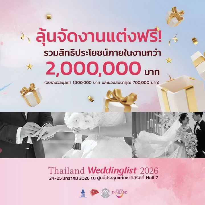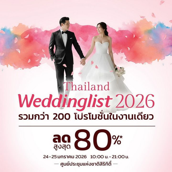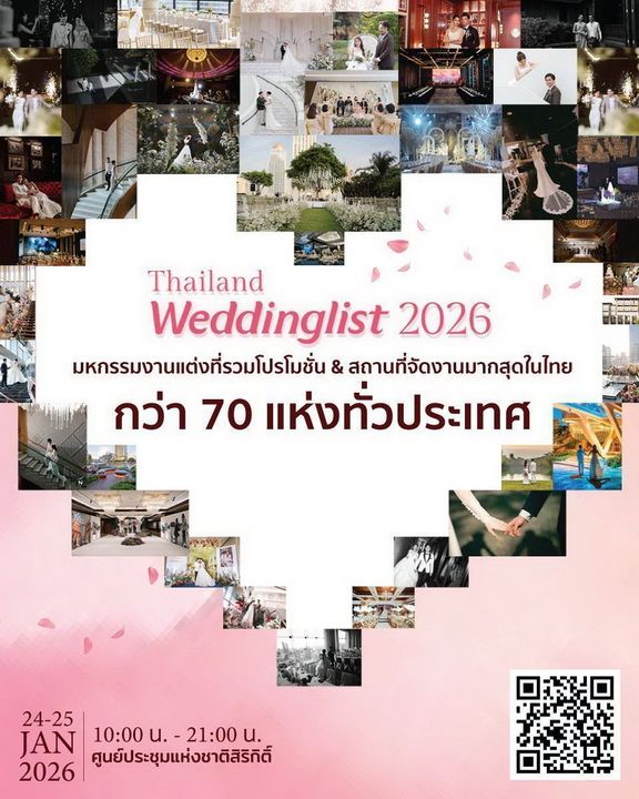 เชิญมาร่วมเป็นส่วนหนึ่งของปรากฏการณ์แห่งความรักในงาน "Thailand Weddinglist 2026" ระหว่างวันที่ 24 – 25 มกราคม 2569 เวลา 10.00 – 21.00 น. ณ ฮอลล์ 7 ชั้น LG ศูนย์การประชุมแห่งชาติสิริกิติ์ (QSNCC)