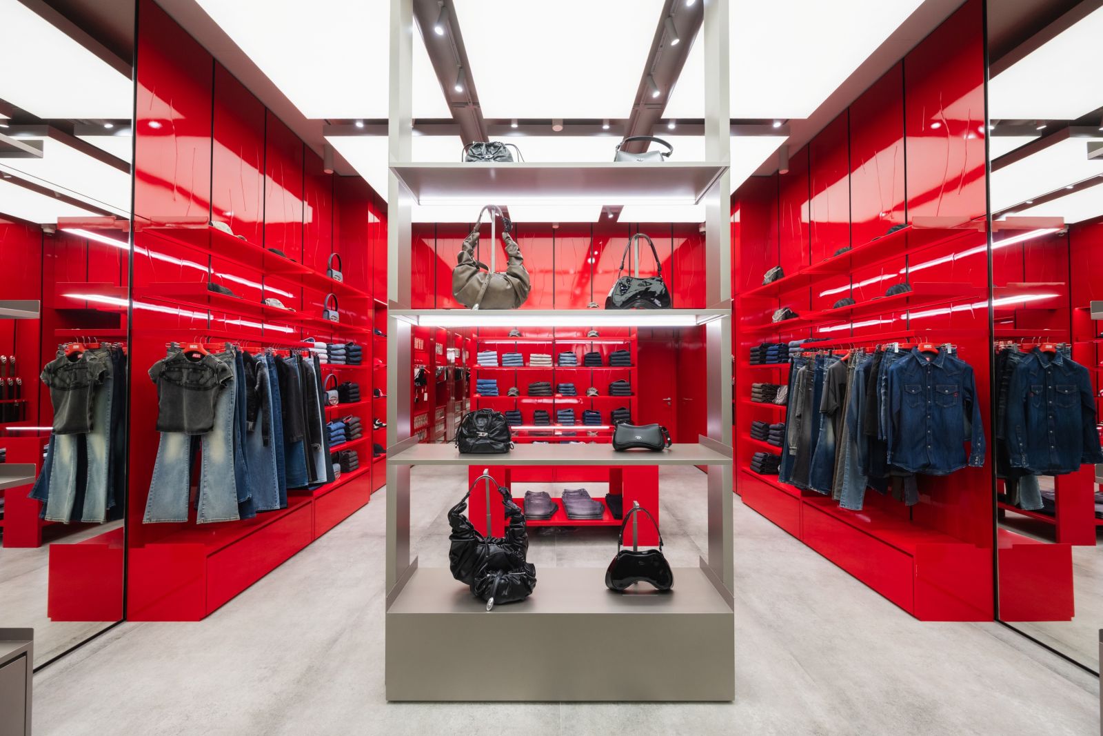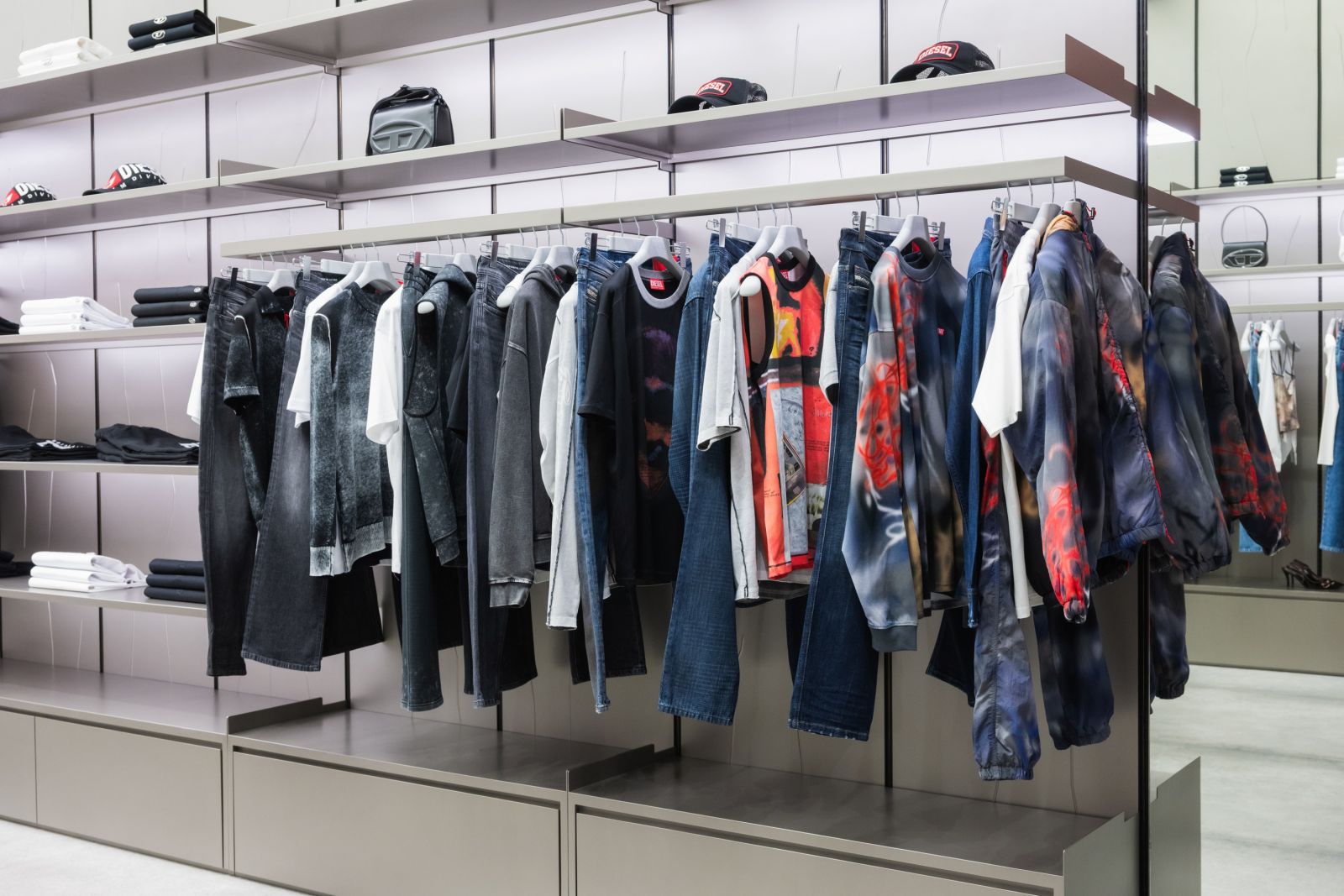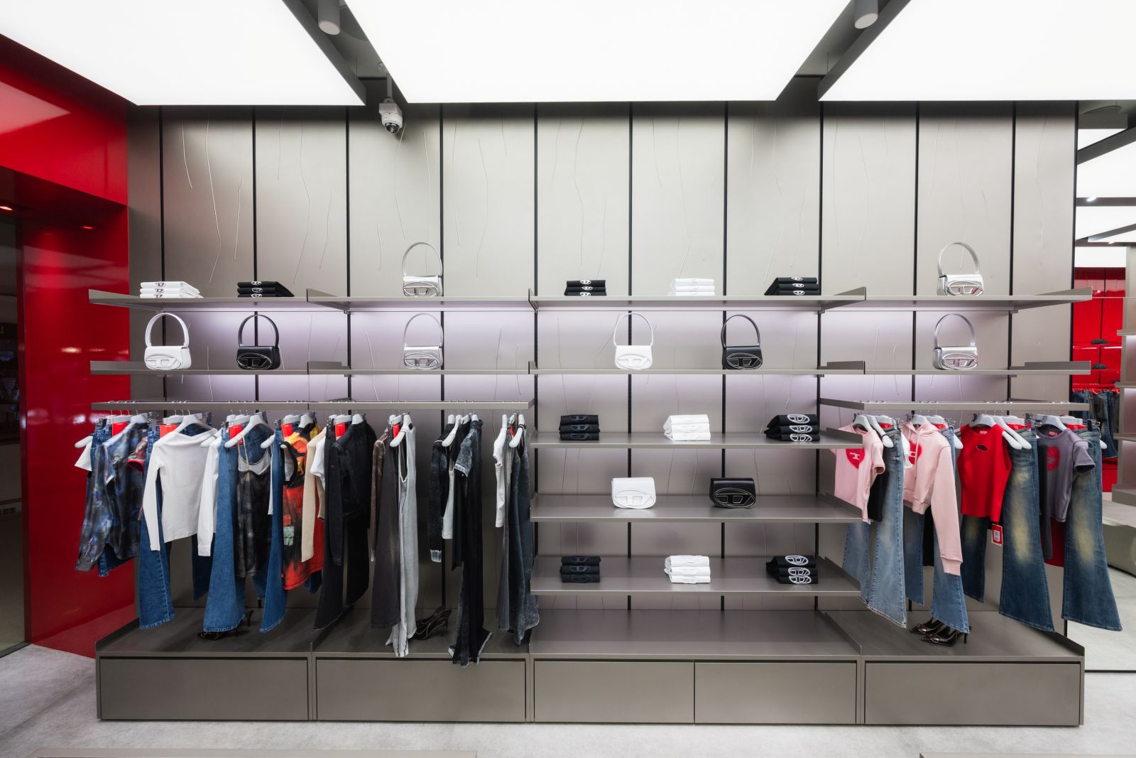 ภายในร้านโดดเด่นด้วยลวดลายบนผนังที่ให้ความรู้สึกพริ้วไหวอย่างเป็นธรรมชาติ สร้างมิติและความเคลื่อนไหว ตัดกับความดิบเท่ตามแบบฉบับของ DIESEL พร้อมทั้งไฟ Lightbox ตลอดแนวเพดานในโซนขาย ช่วยเพิ่มความสว่างและดึงดูดสายตาไปยังคอลเลกชันต่าง ๆ เสริมบรรยากาศการช้อปปิ้งให้โดดเด่นและน่าค้นหา พื้นร้านเลือกใช้กระเบื้อง Aged Concrete จาก DIESEL Living ซึ่งเป็นส่วนหนึ่งของเอกลักษณ์ที่ DIESEL นำมาใช้สร้างความต่อเนื่องในแฟลกชิปสโตร์สำคัญทั่วโลก โทนสีหลักของร้านเน้นเฉดเทาและสีแดงอันเป็นซิกเนเจอร์ของแบรนด์ โดยมีการใช้สีแดงไฮกลอสอย่างโดดเด่นบริเวณทางเข้าและโซนเดนิม ย้ำตัวตนไอคอนิกของ DIESEL ได้ตั้งแต่ก้าวแรกที่เข้าสู่ร้าน