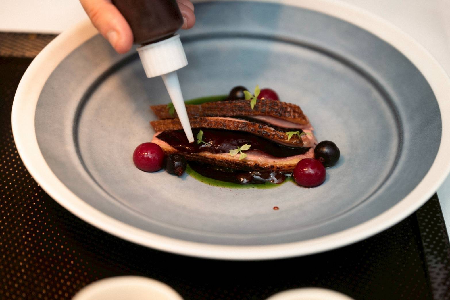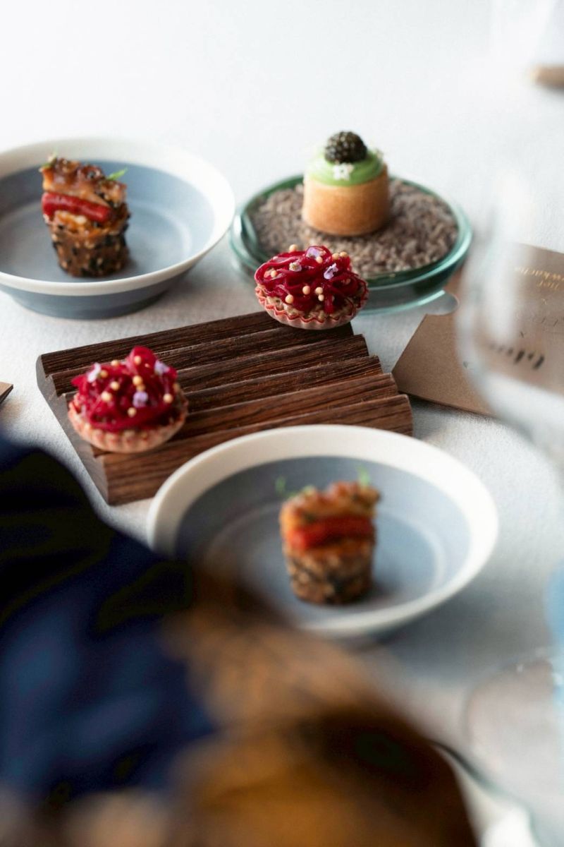 จากนั้นเชฟ Kevin Wong ได้นำเสนอเมนูเครื่องในวัวในมุมมองแปลกใหม่ ผสานด้วยทรัฟเฟิลดำฤดูหนาวจากแคว้นเปริโกร์ (Périgord) ประเทศฝรั่งเศส ก่อนเสิร์ฟจานไฮไลต์อย่างกุ้งล็อบสเตอร์สีน้ำเงินจากแคว้นบริตตานี (Brittany) เสิร์ฟคู่กับซอสลักซา ซึ่งผสานวัตถุดิบฝรั่งเศสเข้ากับมิติรสชาติของเอเชียตะวันออกเฉียงใต้ได้อย่างกลมกลืน ต่อด้วยเชฟ Evens López กับเมนูซิกเนเจอร์จาก Blue by Alain Ducasse อย่างเป็ดบาร์บารี (Barbary Duckling) รมควัน ปรุงกลิ่นด้วยสมุนไพร Lovage เสิร์ฟคู่กับเรดิคคิโอและแบล็กเคอร์แรนต์ ซึ่งเป็นเมนูที่สะท้อนสไตล์การทำอาหารอันประณีตแต่ทรงพลังของเขาได้อย่างชัดเจน ส่วนช่วงเวลาของหวานยกให้กับ เชฟเดช คิ้วคชา ที่สร้างความประทับใจให้แขกด้วยของหวานจากเชอร์รี พิสตาชิโอ และทรัฟเฟิลดำ ตามด้วยของหวานจากมันเทศ เสิร์ฟพร้อมกาแฟและโยเกิร์ต ก่อนปิดท้ายคำคืนสุดพิเศษด้วย มินยาร์ดีส (Mignardises) ที่เชฟทั้งสามท่านร่วมกันรังสรรค์ขึ้น เพื่อแทนคำขอบคุณและการอำลา