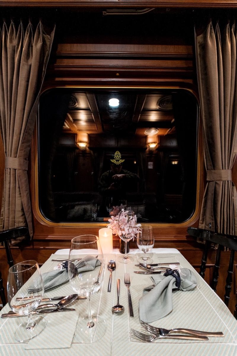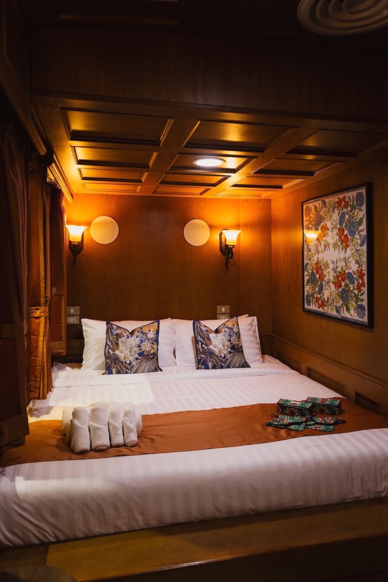 ภายในขบวนรถไฟประกอบด้วยโซนชมวิว ห้องอาหาร และห้องพักส่วนตัว แต่ละโซนประดับด้วยผ้าจาก Jim Thompson Home Furnishings ที่โด่งดังจากผ้าคุณภาพสูงที่โรงแรมและที่พักอาศัยระดับไฮเอนด์ทั่วโลกเลือกใช้ แต่ละมุมสะท้อนความเป็นไทยด้วยผ้าไหม ทั้งผ้าม่าน ปลอกหมอน ผ้าคาดเตียง ไปจนถึงผ้าปูโต๊ะ รวมถึงไอเทมบนโต๊ะอาหาร อาทิ แผ่นรองจาน ผ้าเช็ดปาก ที่รองแก้ว ไปจนถึงชุดสิ่งอำนวยความสะดวก (Amenity Kit) ที่ประกอบด้วยกระเป๋าเครื่องสำอางและผ้าปิดตา ไอเทมส่วนใหญ่อวดลายพรินต์ที่ดึงแรงบันดาลใจมาจากธรรมชาติ และหลายชิ้นเชิดชูเทคนิคการทอผ้าแบบดั้งเดิมเพื่อถ่ายทอดความประณีตของงานหัตถศิลป์ไทย