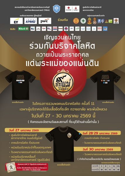 ศูนย์บริการโลหิตแห่งชาติ สภากาชาดไทย ร่วมกับ สมาคมธรรมศาสตร์ ในพระบรมราชูปถัมภ์ มหาวิทยาลัยธรรมศาสตร์ สมาคมนักศึกษาเก่าคณะต่างๆ โรงพยาบาลธรรมศาสตร์เฉลิมพระเกียรติ และหน่วยงานต่างๆ ของ มหาวิทยาลัยธรรมศาสตร์ จัดกิจกรรม “รวมพลคนบริจาคโลหิต ครั้งที่ 11 ธรรมศาสตร์รวมใจ ชวนคนไทยบริจาคโลหิต ถวายเป็นพระราชกุศล แด่พระแม่ของแผ่นดิน” ตั้งแต่วันนี้ - 30 มกราคม 2569 ผู้บริจาคโลหิตในโครงการจะได้รับเสื้อยืด “๙ พระแม่ของแผ่นดิน” เป็นที่ระลึก โดยมีพิธีเปิดกิจกรรมเมื่อวันที่ 27 มกราคม 2569 เวลา 10.00 น. ณ ณ ศูนย์บริการโลหิตแห่งชาติ ถ.อังรีดูนังต์