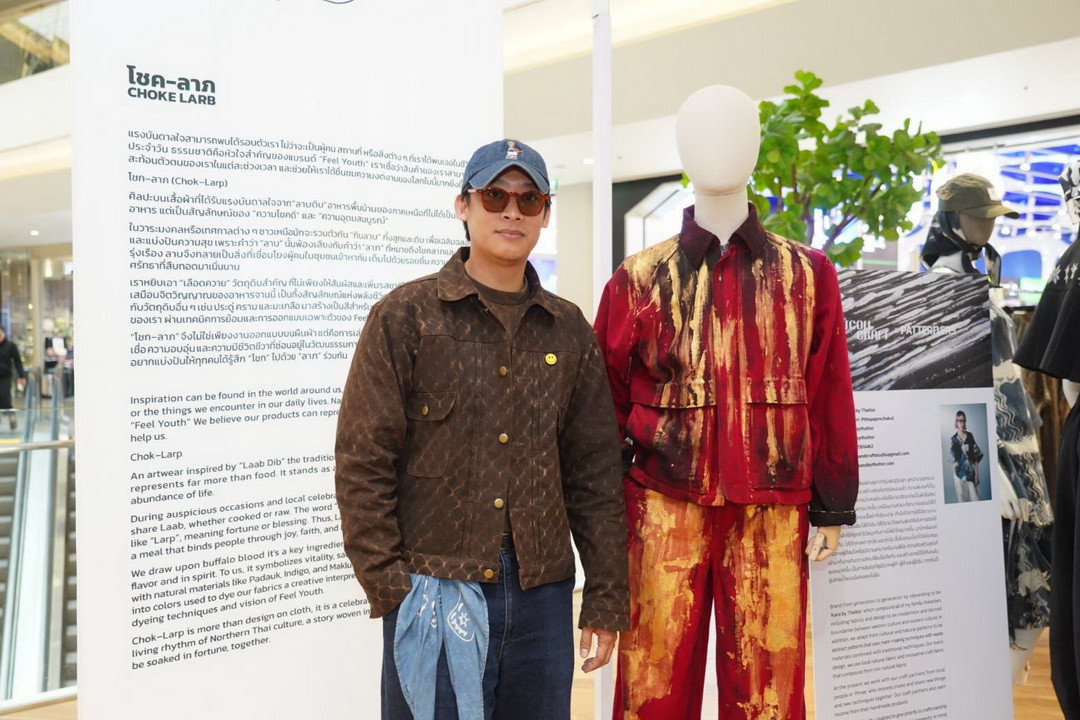 ส่วน “FEEL YOUTH” แบรนด์แฟชั่นจากจังหวัดเชียงใหม่ที่นำแรงบันดาลใจจากสีสัน ศิลปะ และธรรมชาติรอบตัว มาออกแบบเป็นเสื้อผ้าที่สะท้อนความสนุก ความงาม และความเยาว์ ได้อย่างมีชีวิตชีวา เพื่อให้ทุกคนได้ “Feel Youth” ในแบบของตัวเอง นำเสนอผลงาน “โชก–ลาภ” เสื้อผ้าสีแดงทองที่เกิดจากการย้อมด้วยเลือดควาย ผสานกับส่วนผสมทั้งจากธรรมชาติและเคมี สื่อถึงการโชกไปด้วยเลือด อันเปรียบเสมือนจิตวิญญาณของควาย ซึ่งเป็นวัตถุดิบหลักของลาบดิบในวัฒนธรรมภาคเหนือของไทย แต่งแต้มด้วยสีทอง สัญลักษณ์ของความโชคดี ที่สื่อถึงคำว่า “ลาบ” ซึ่งพ้องเสียงกับ “ลาภ” เพื่อให้ผลงานชิ้นนี้สะท้อนพลังแห่งโชคลาภและความเชื่อที่สืบต่อกันมา โดย ดุจกมล และ ภูวดล จันทรเกษม สองผู้ร่วมก่อตั้งและเจ้าของแบรนด์ ขยายความว่า “ผลงานนี้เป็นศิลปะบนเสื้อผ้าที่ได้รับแรงบันดาลใจจาก ‘ลาบดิบ’ อาหารพื้นบ้านของภาคเหนือที่ไม่ได้เป็นเพียงอาหาร แต่เป็นสัญลักษณ์ของความโชคดีและความอุดมสมบูรณ์ เพราะคำว่า ‘ลาบ’ นั้นพ้องเสียงกับคำว่า ‘ลาภ’ ที่หมายถึงโชคลาภและความรุ่งเรือง ลาบจึงกลายเป็นสิ่งที่เชื่อมโยงผู้คนในชุมชนเข้าหากัน ด้วยรอยยิ้ม ความเชื่อ และศรัทธาที่สืบทอดมาเนิ่นนาน โดยเราเลือกหยิบเอา ‘เลือดควาย’ วัตถุดิบสำคัญที่เปรียบเสมือนจิตวิญญาณของอาหารจานนี้ มาสร้างเป็นสีสำหรับการย้อมผ้า เพื่อถ่ายทอดมุมมองผ่านเทคนิคการย้อมและการออกแบบเฉพาะตัวของ FEEL YOUTH”